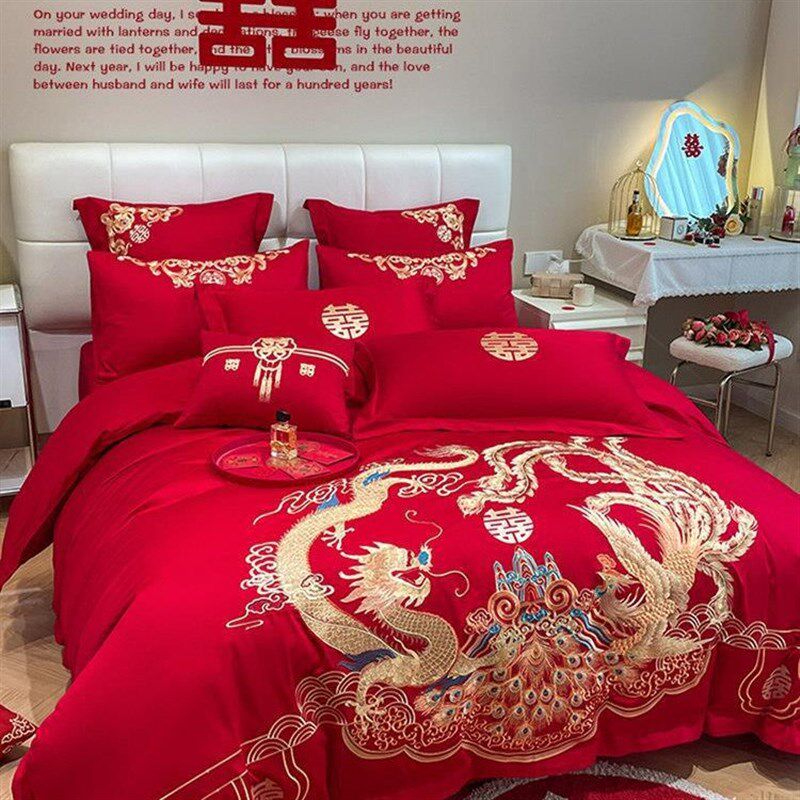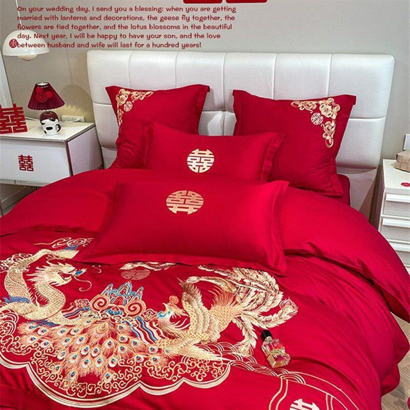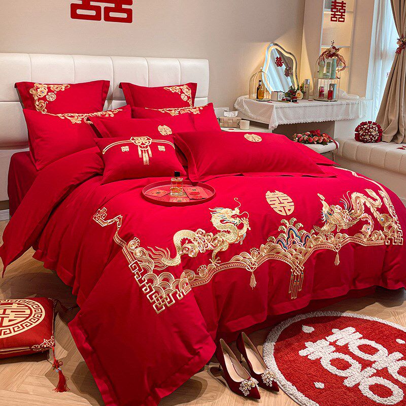 中式龙凤刺绣结婚四件套大红色床单被套喜被婚庆床上用品