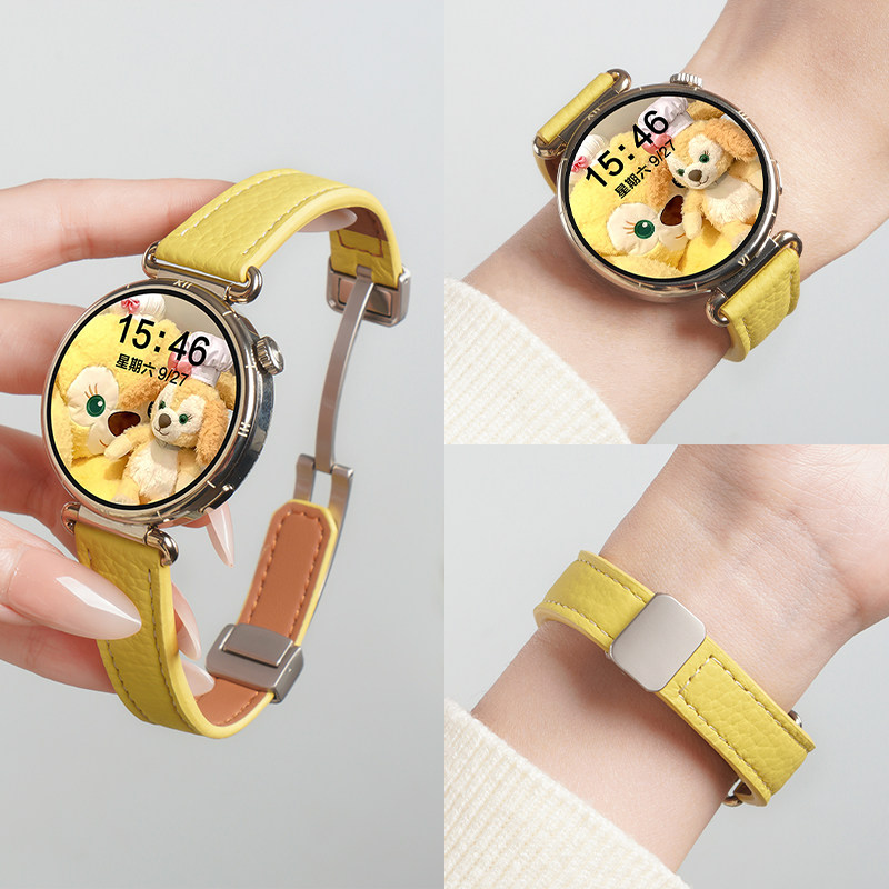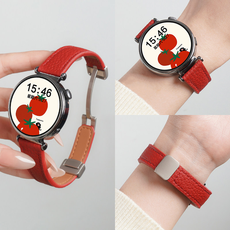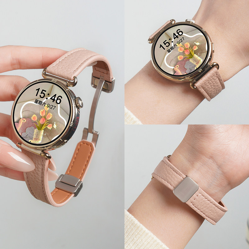 适用华为GT6手表带荔枝纹真皮磁吸扣表带watchgt6智能腕表GT5新女款watch5专用gt5pro通用春夏gt4替换链配件