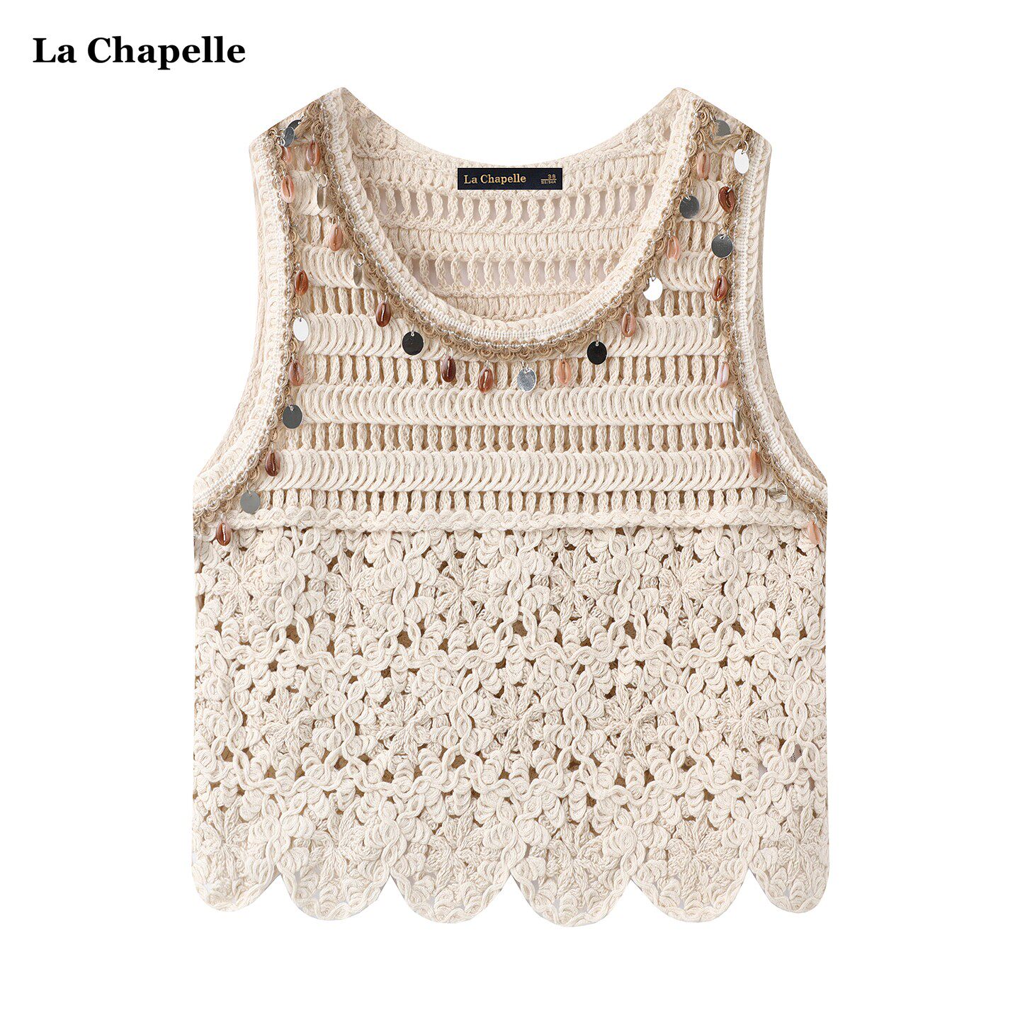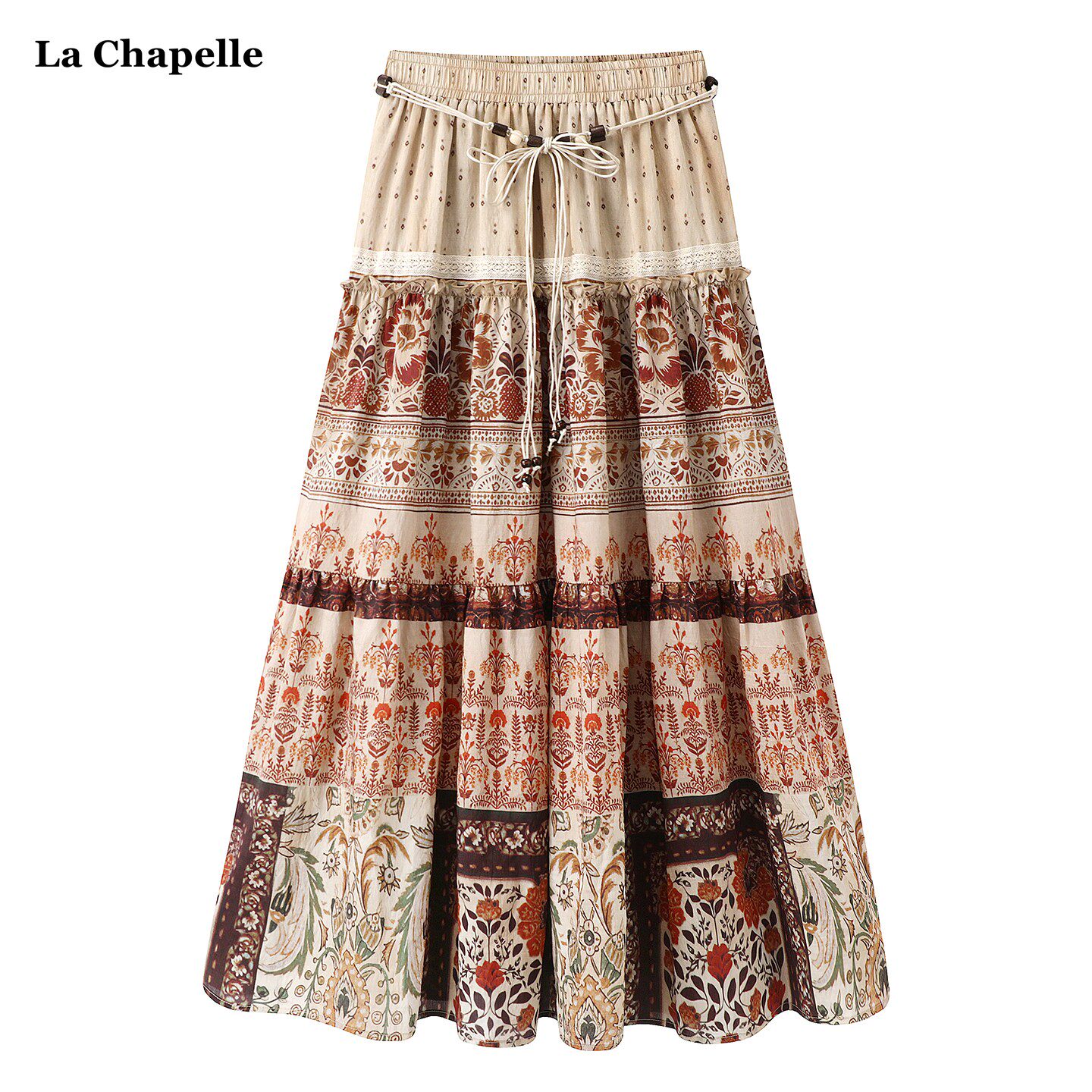 拉夏贝尔/La Chapelle夏季波西米亚镂空钩花背心印花半身裙套装女