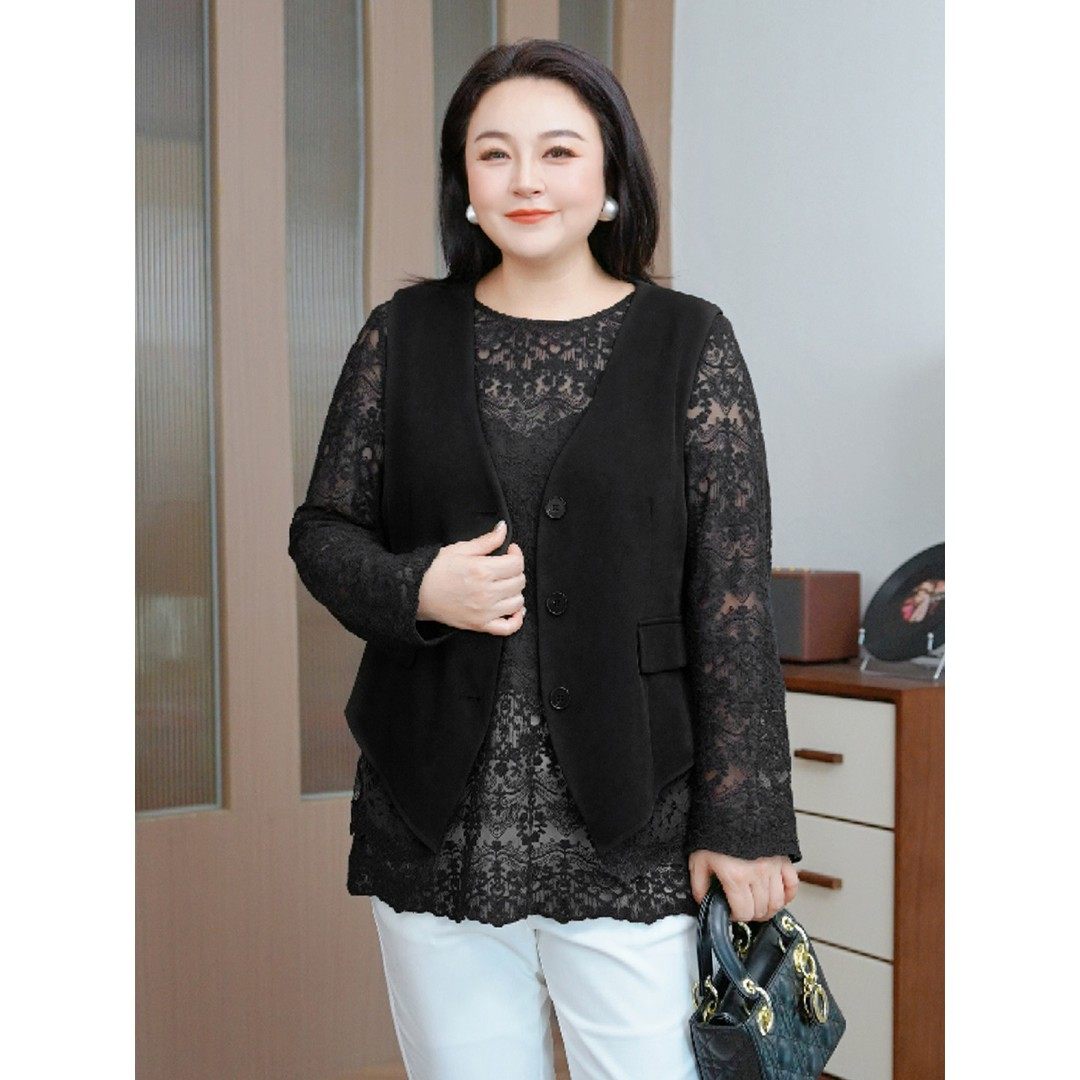 MsShe大码女装春优雅拼接蕾丝开叉下摆西装马甲外套J~E2503067