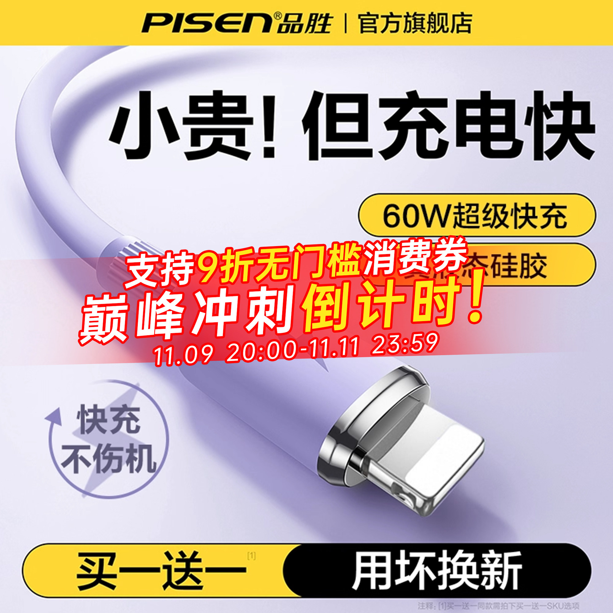 品胜适用苹果15/14充电线iphone17数据线60W超级快充13手机闪充12/11车载16充电器线ipad平板typec转lighting