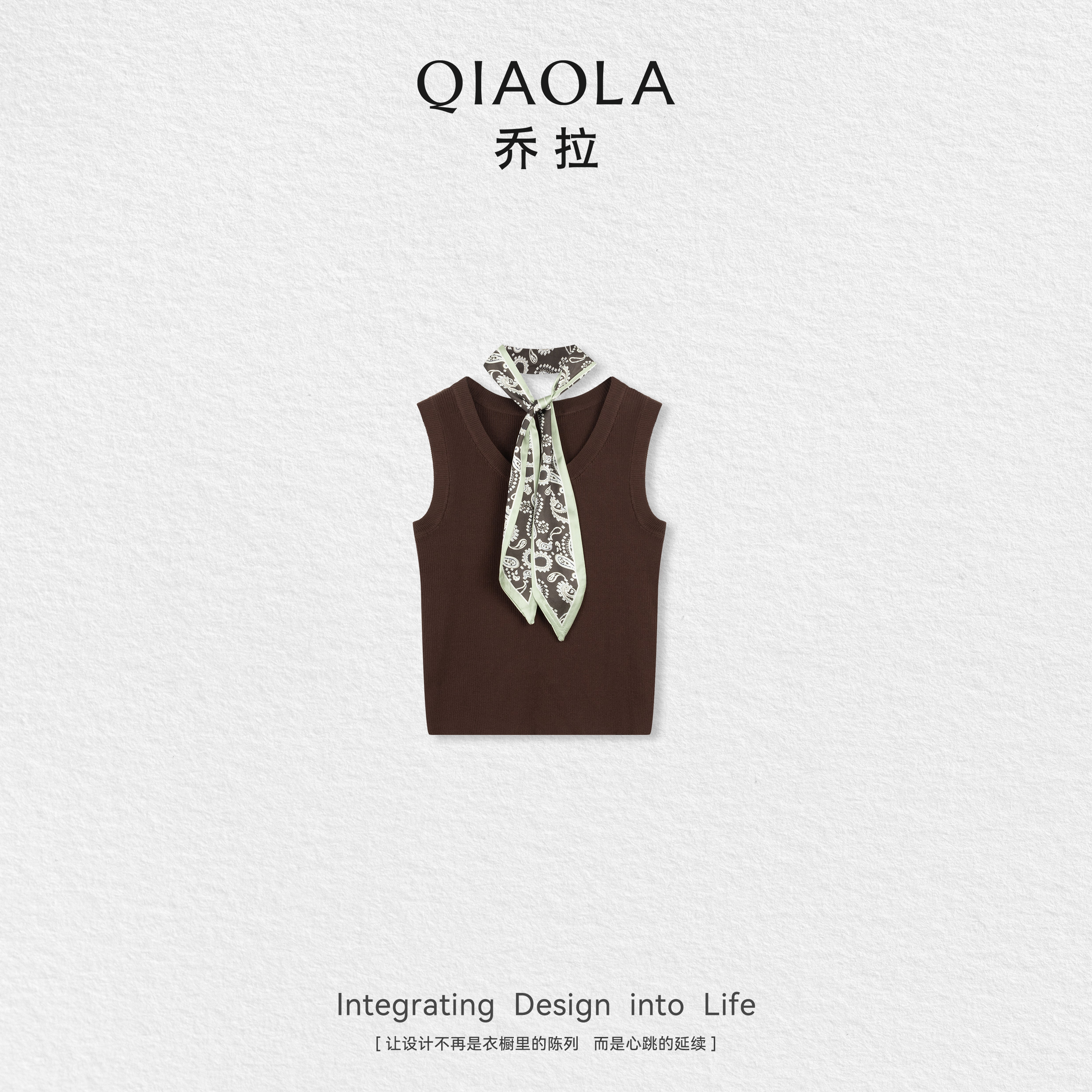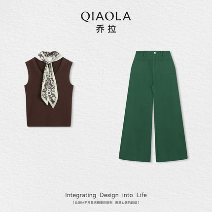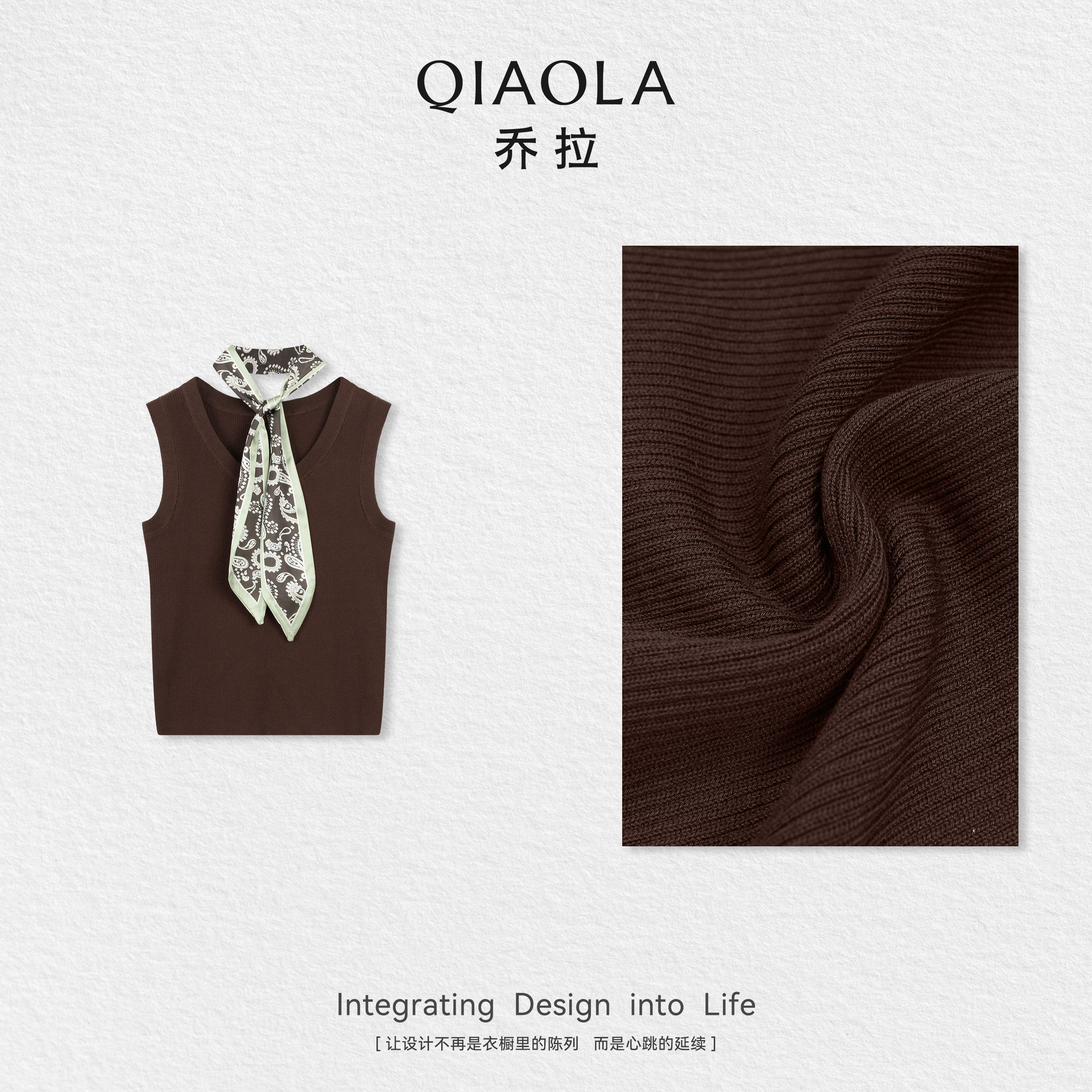 乔拉【苔原暮色】秋季新款咖色圆领背心丝巾无袖上衣阔腿裤套装女
