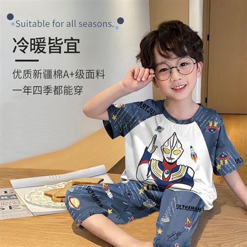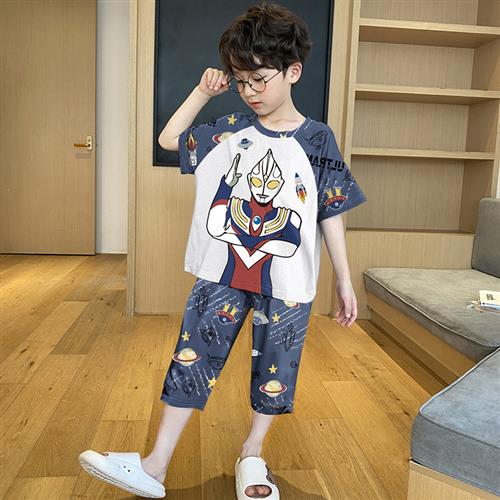 男童纯棉睡衣夏季薄款短袖七分裤儿童空调服小男孩奥特曼卡通套装
