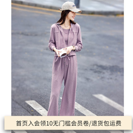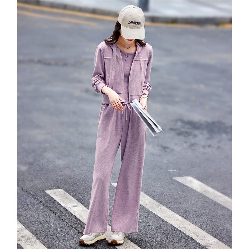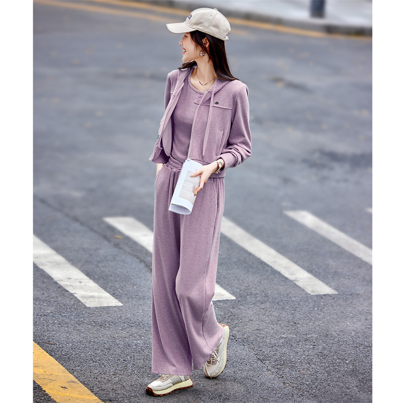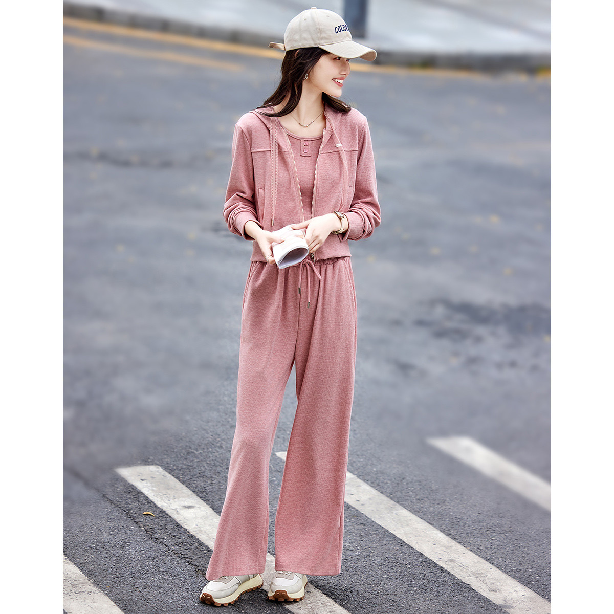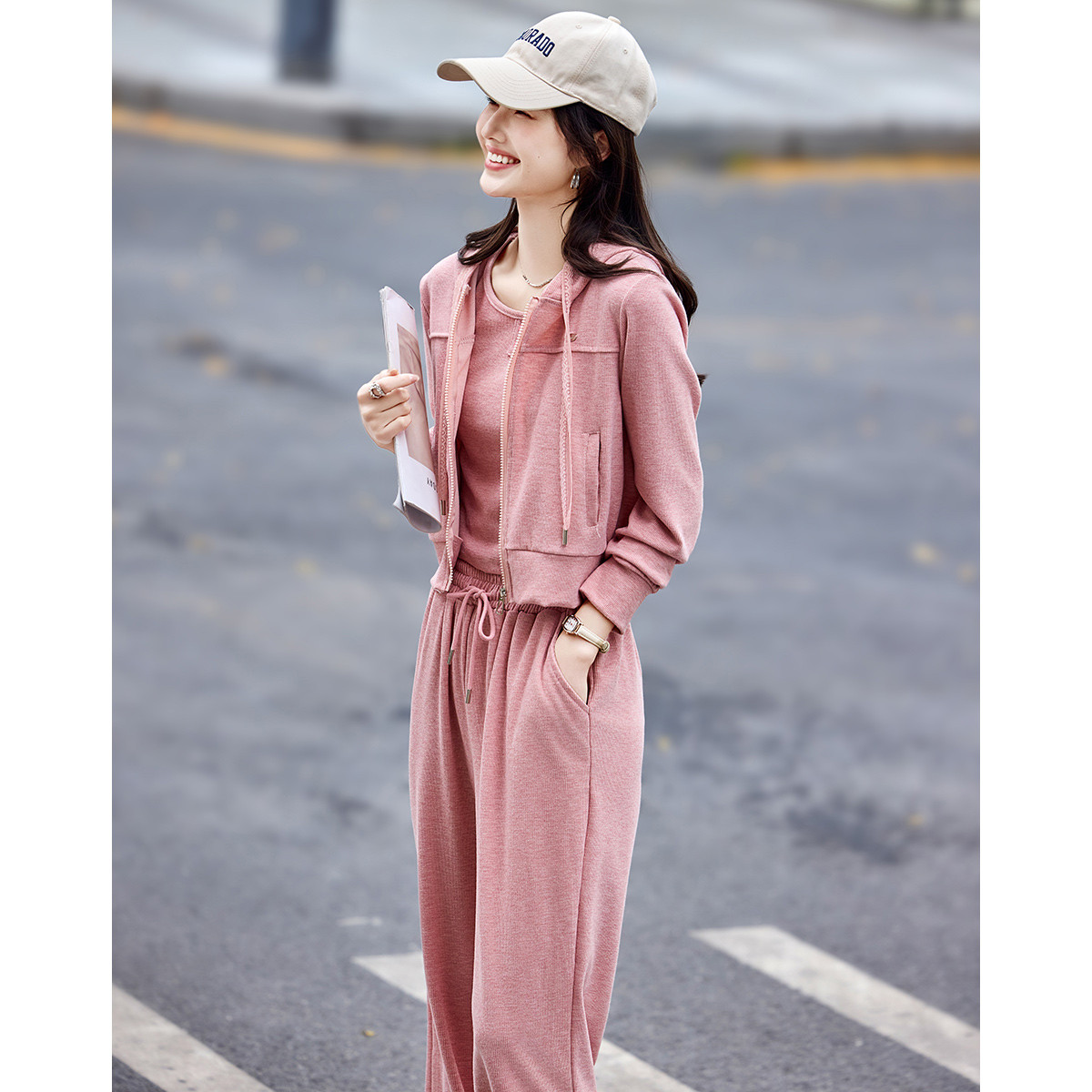 慵懒风松弛感休闲套装2025春季新款靓丽连帽外套休闲裤三件套