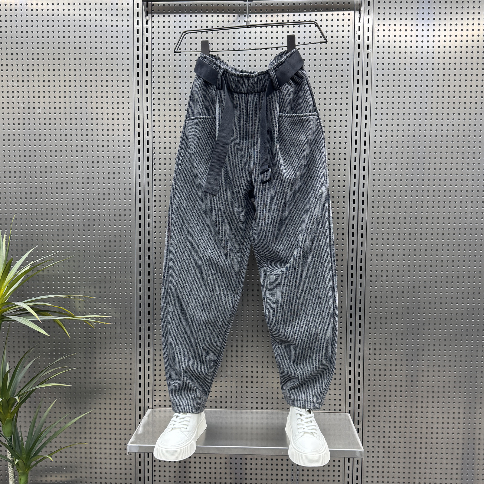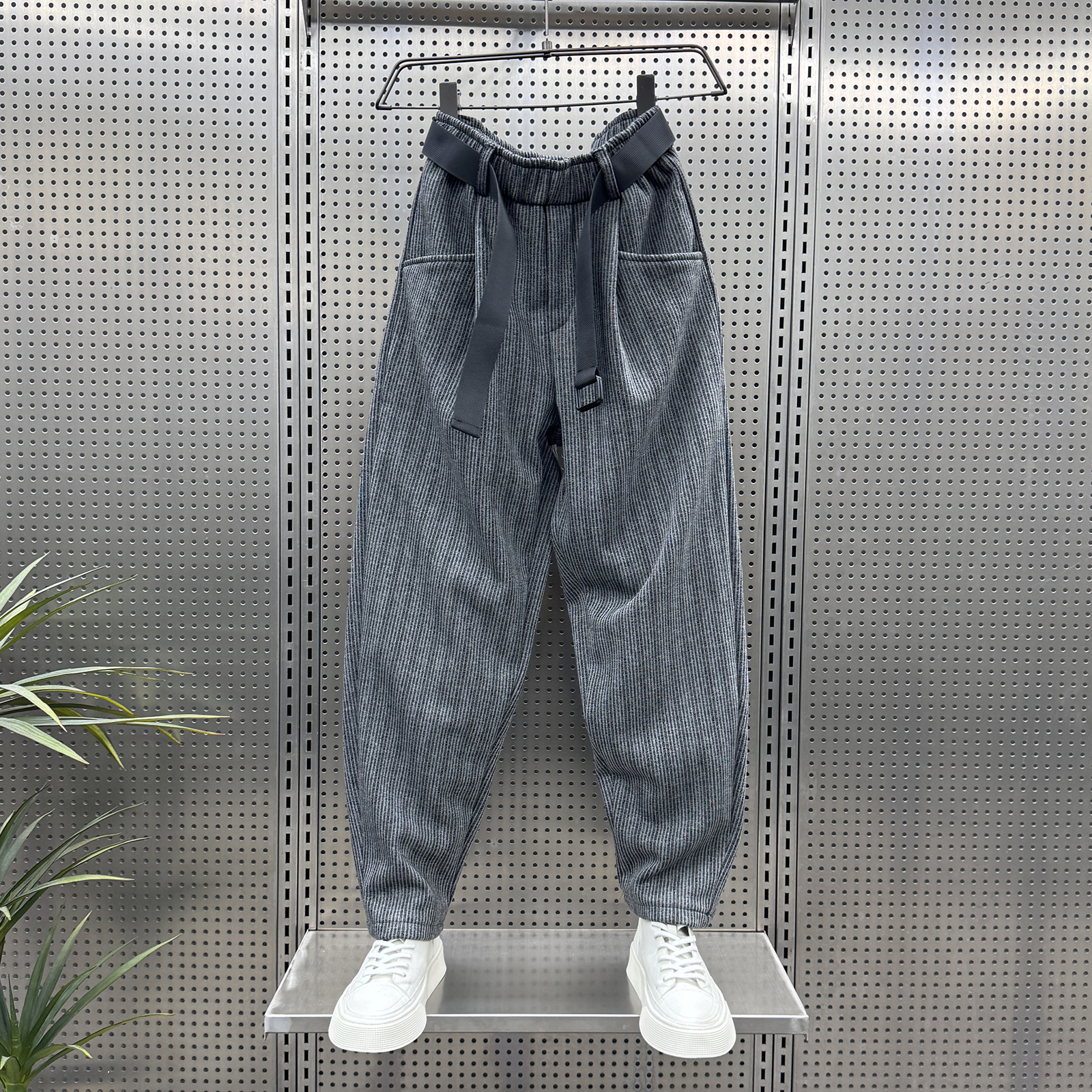 秋冬加绒复古条纹哈伦裤男韩版美式毛呢休闲裤个性腰带痞帅老爹裤