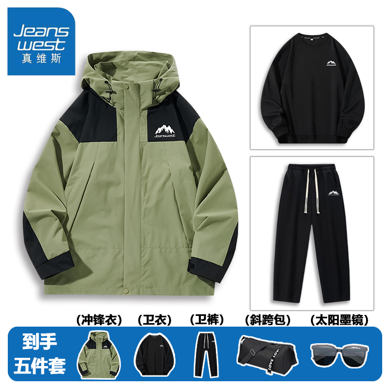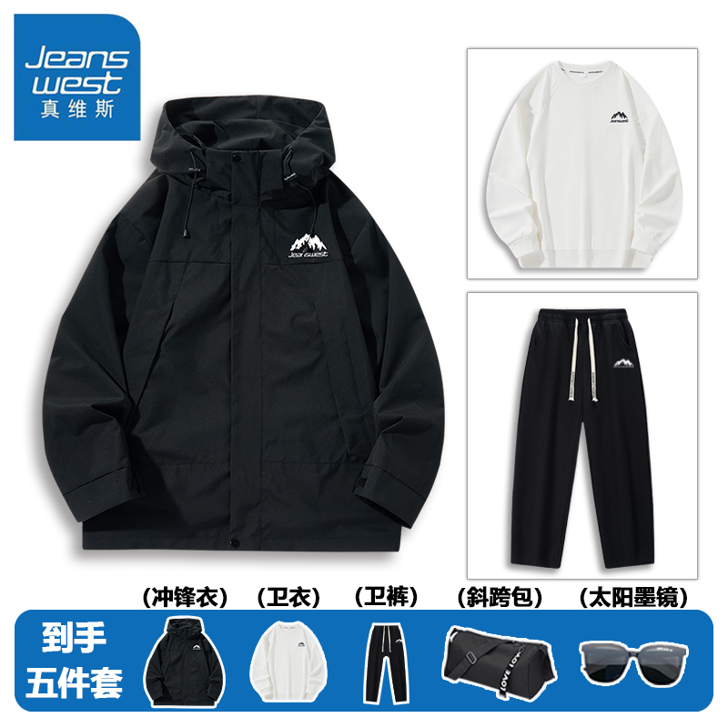 真维斯连帽冲锋衣夹克外套男女春秋季情侣款三件套装卫衣卫裤休闲