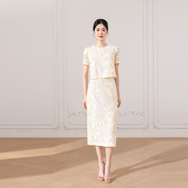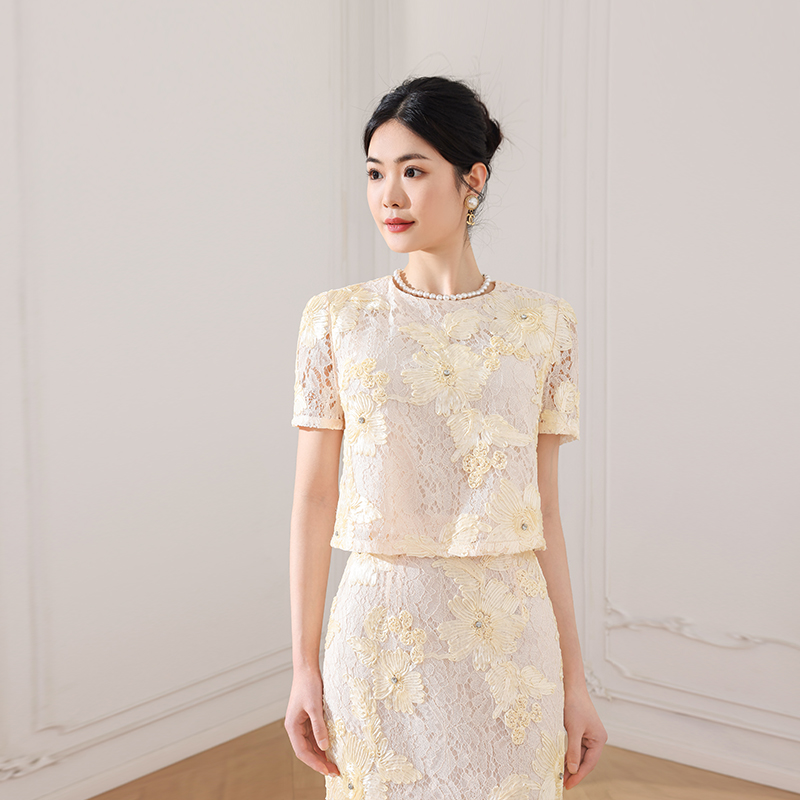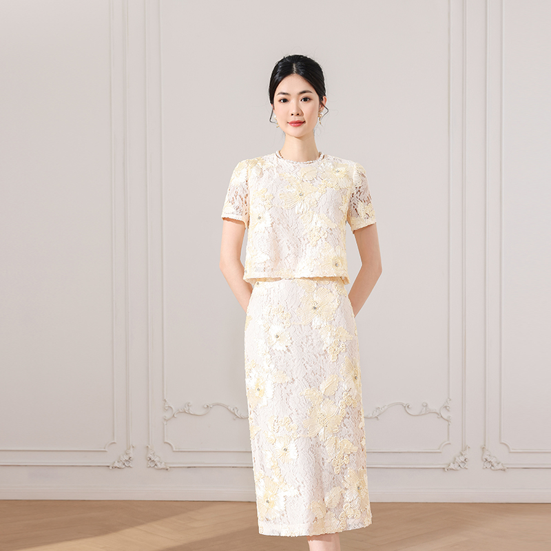 希区瑞普2025春夏新款法式复古蕾丝镂空短袖上衣+轻熟气质半身裙