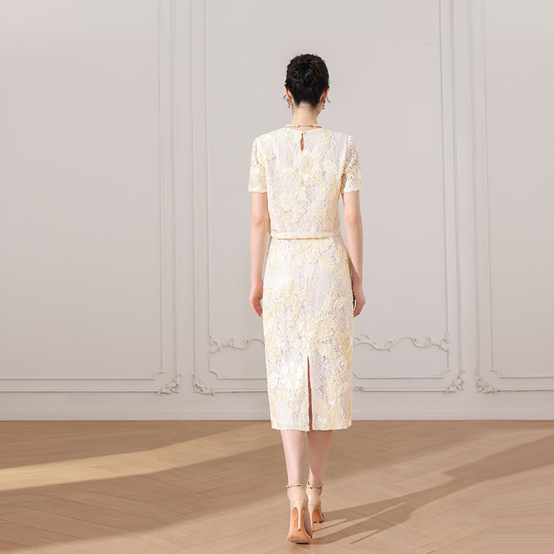 法式复古蕾丝镂空短袖半身裙套装