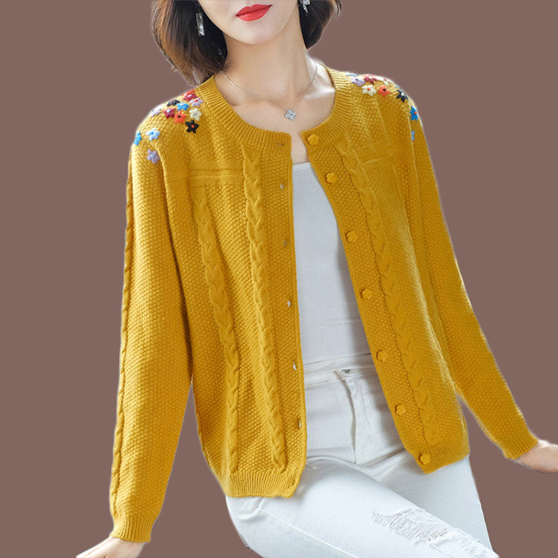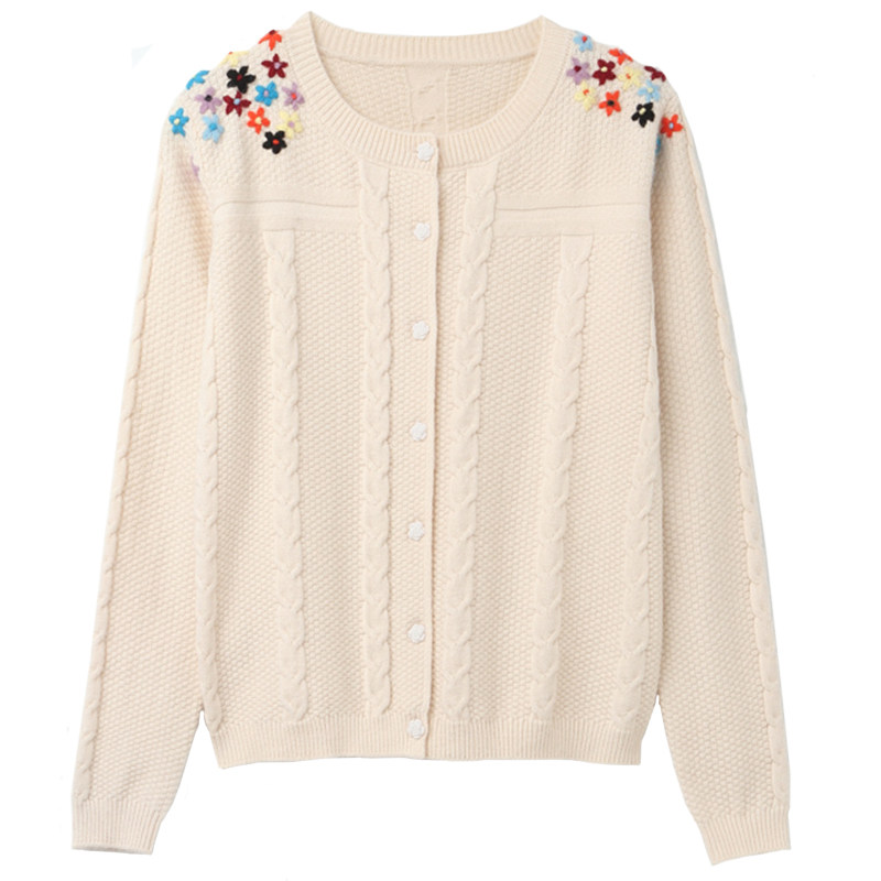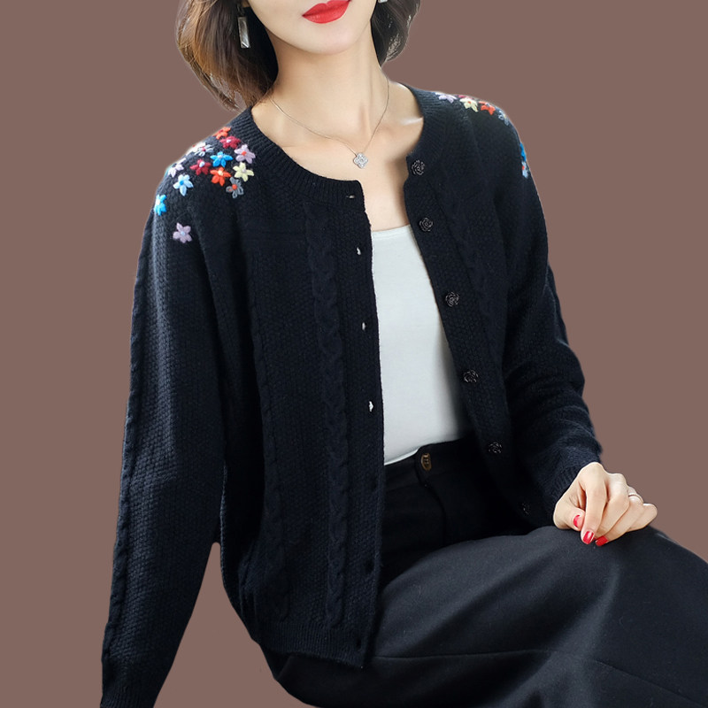 鄂尔多斯市100%纯羊绒开衫羊毛针织外套女绣花新款早春妈妈装毛衣
