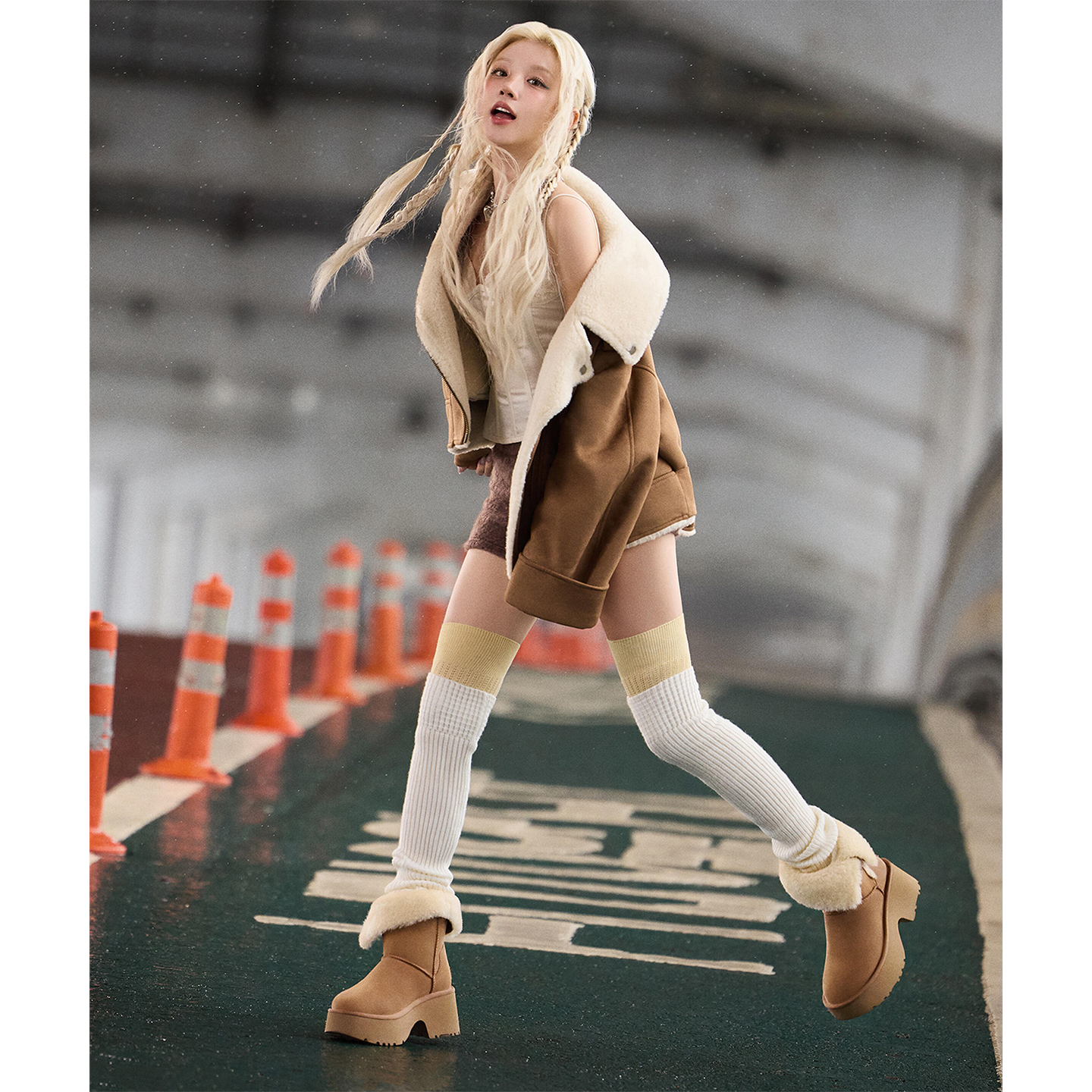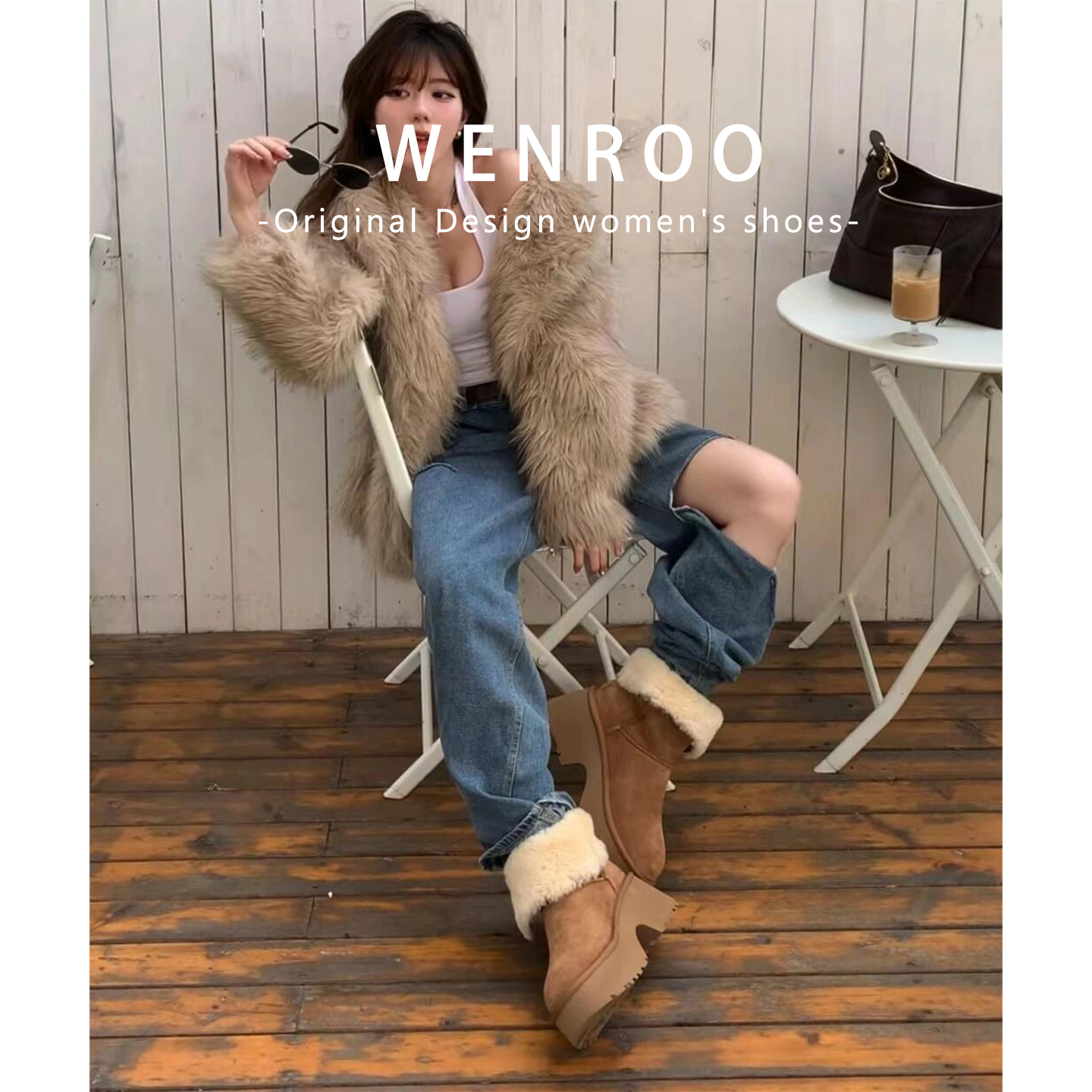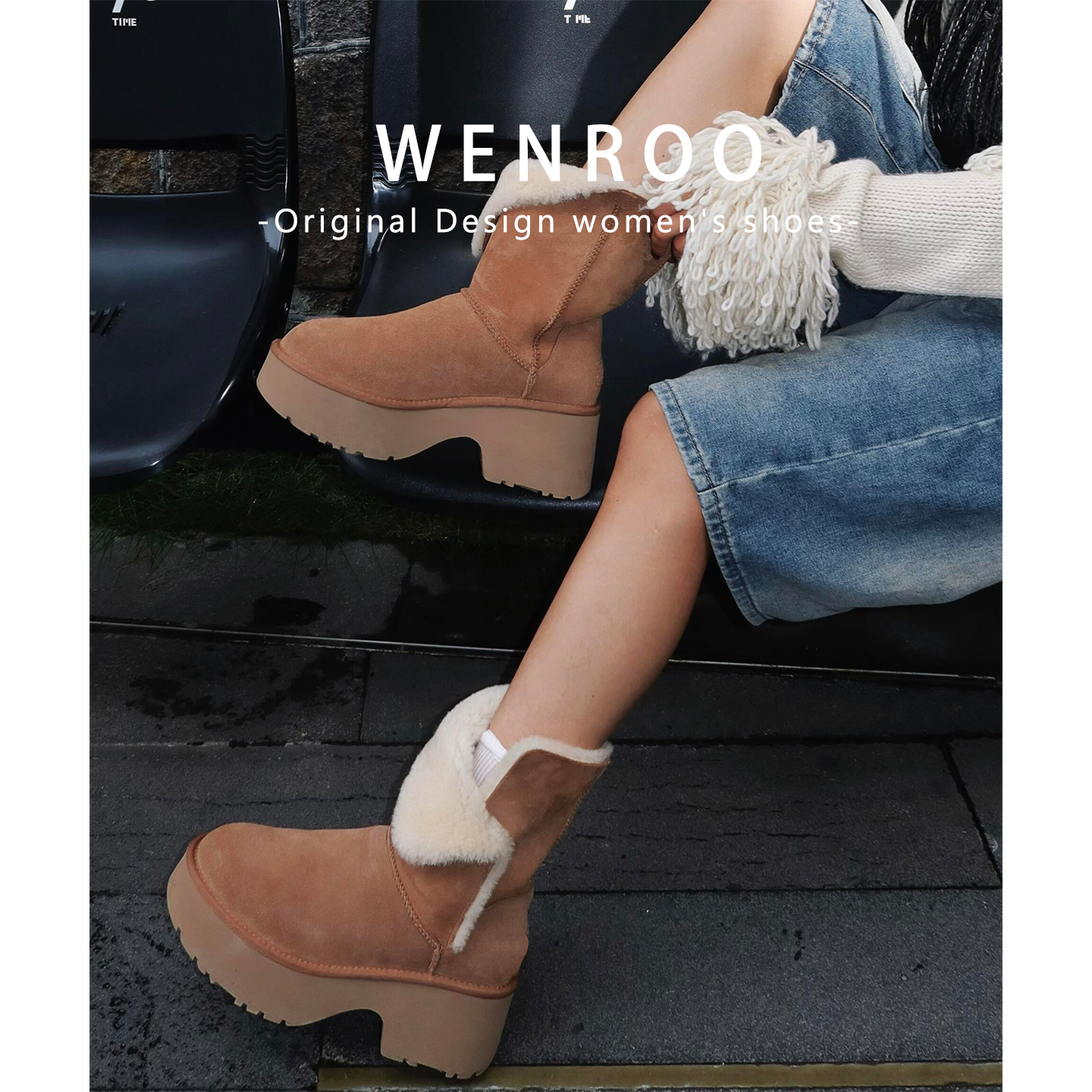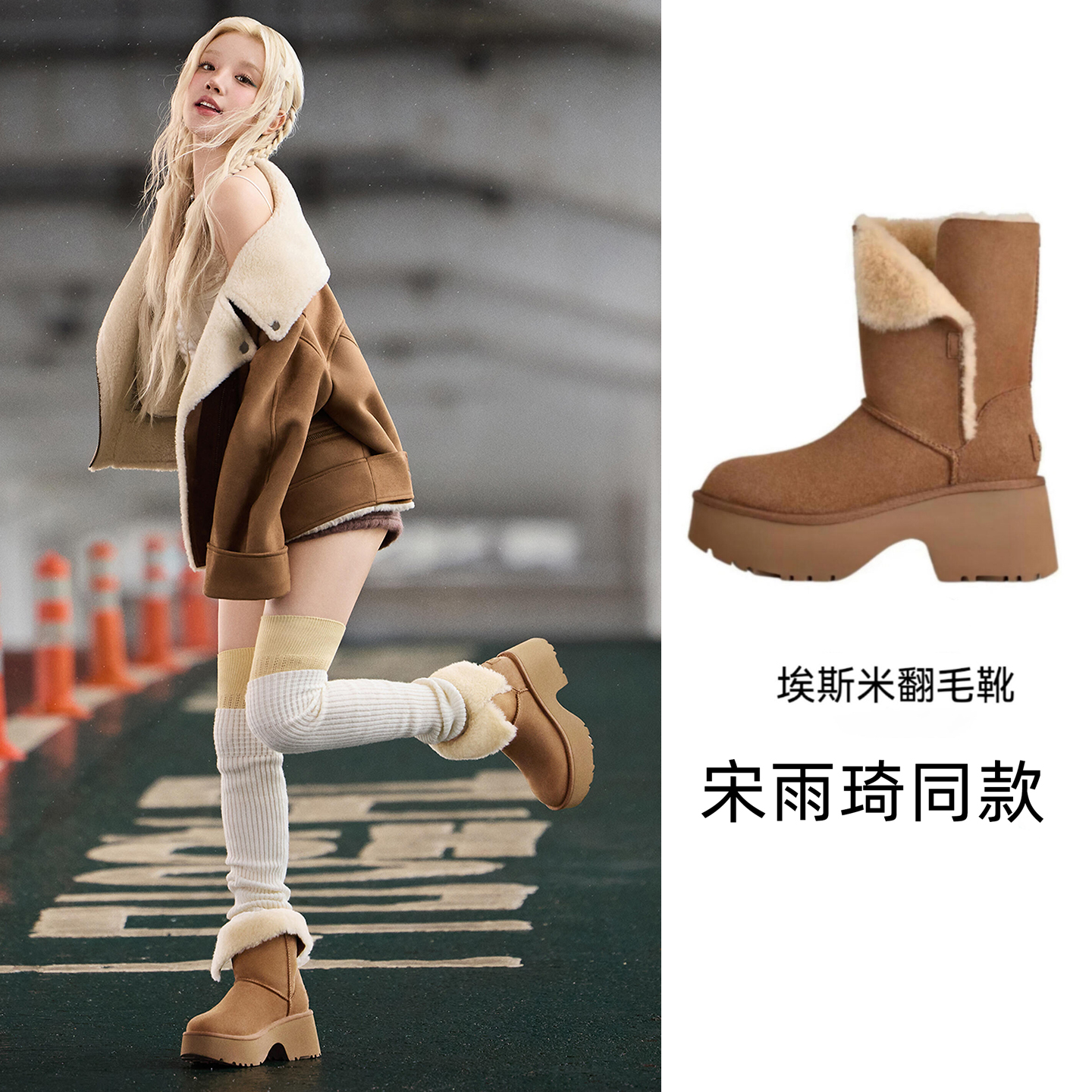 宋雨琦同款!棕色真皮毛一体加绒加厚底雪地靴女冬季短筒翻折棉鞋