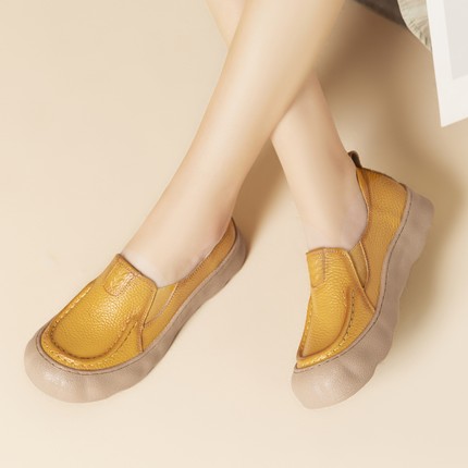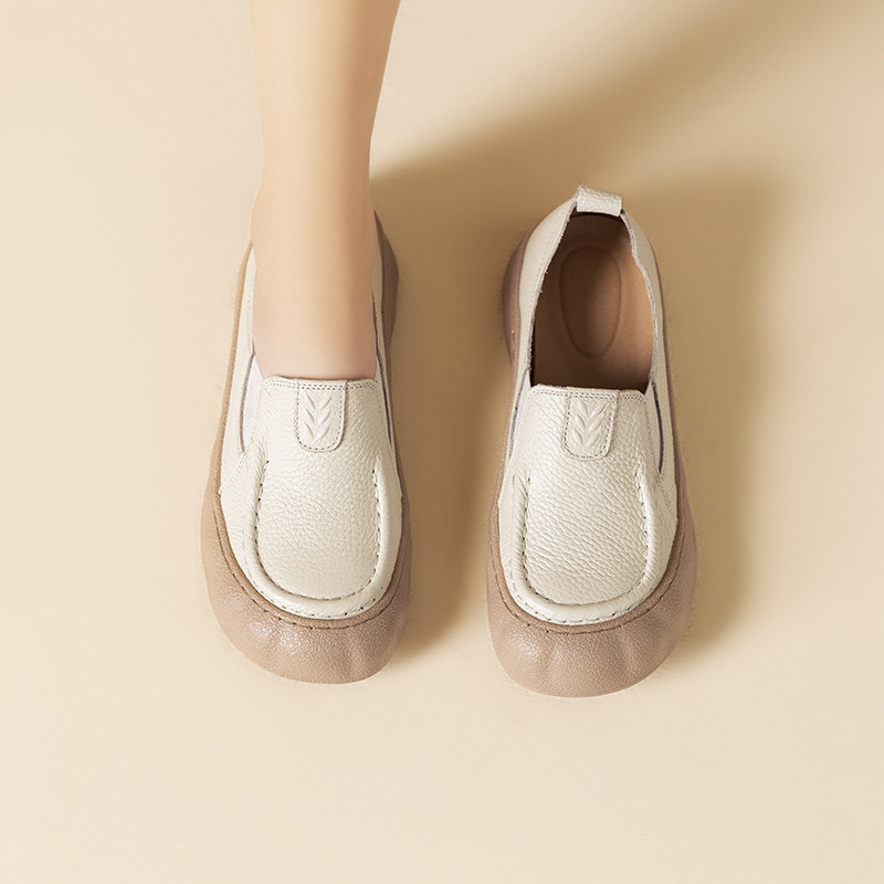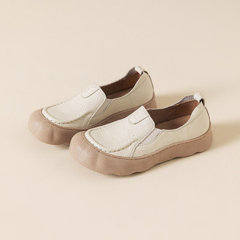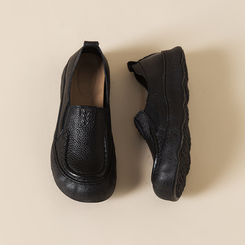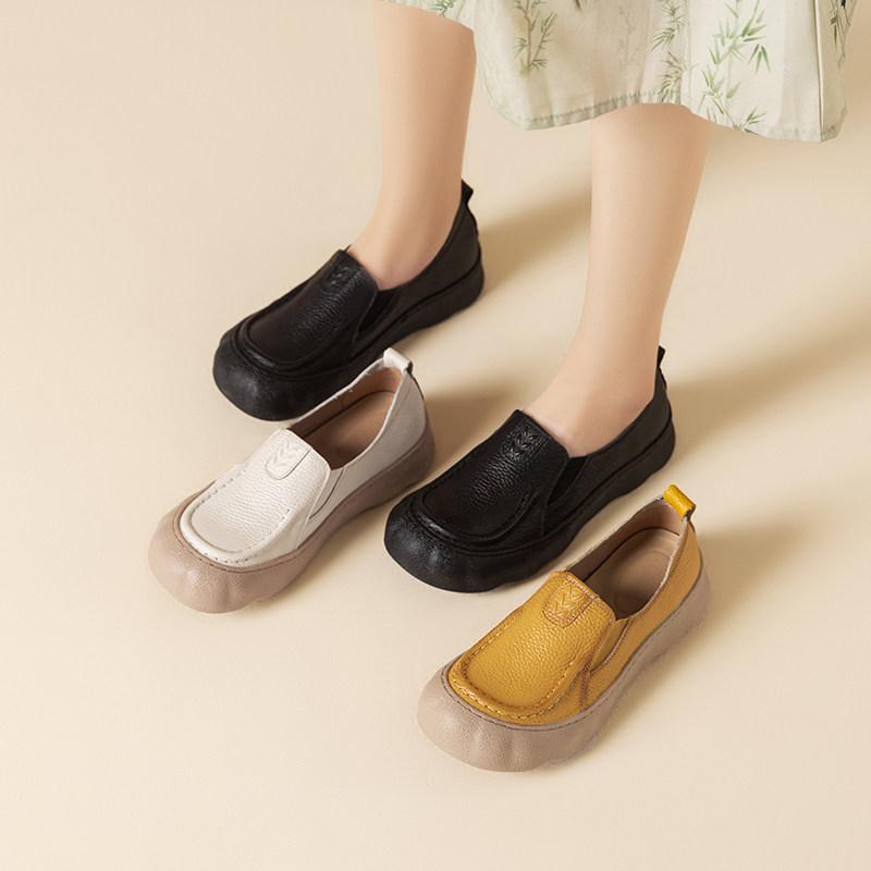 舒适真皮一脚蹬乐福鞋女平底防滑浅口单鞋春秋皮鞋宽脚胖脚妈妈鞋