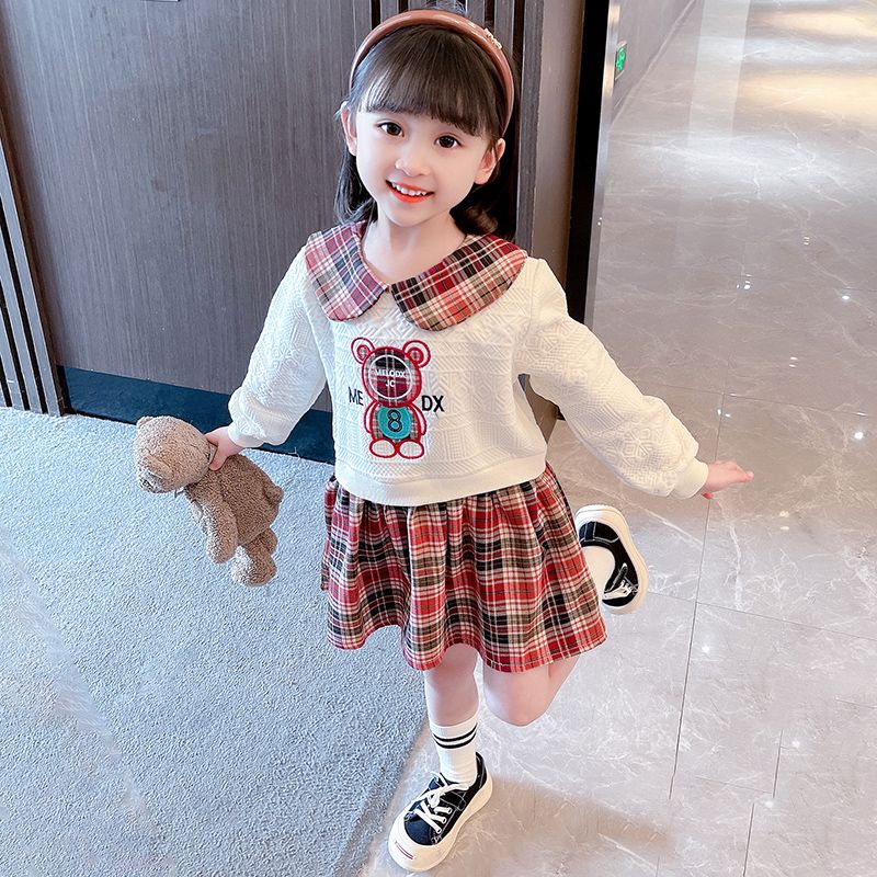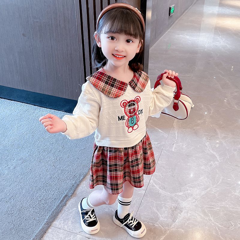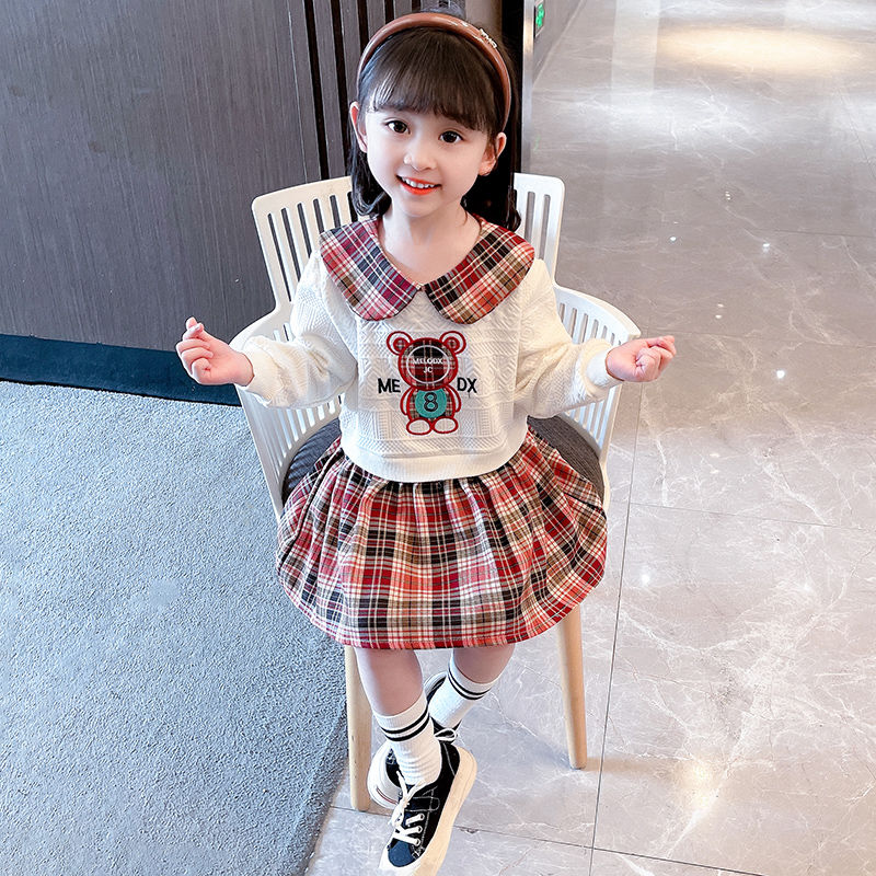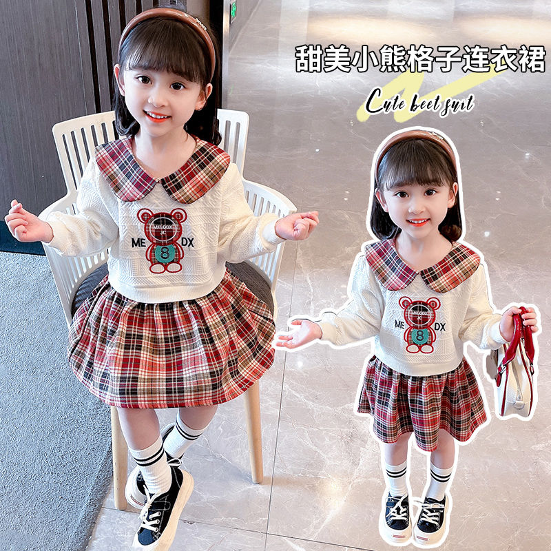 小黄鸭布咚女童春秋连衣裙长袖卡通公主裙宝宝洋气格子裙假两件裙