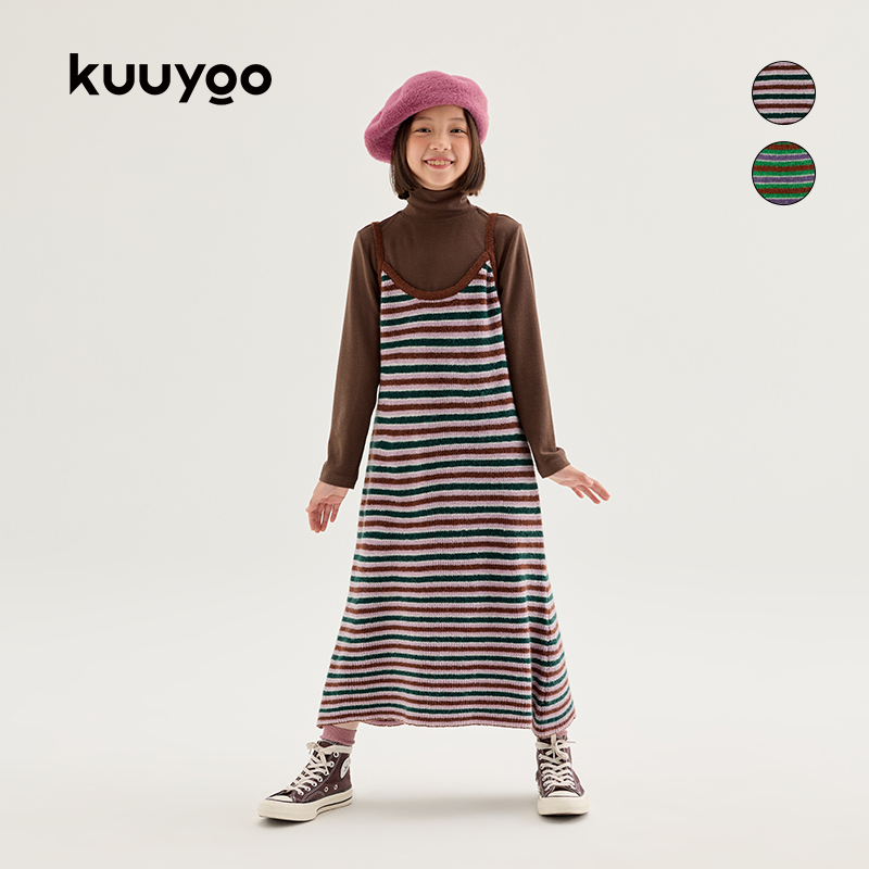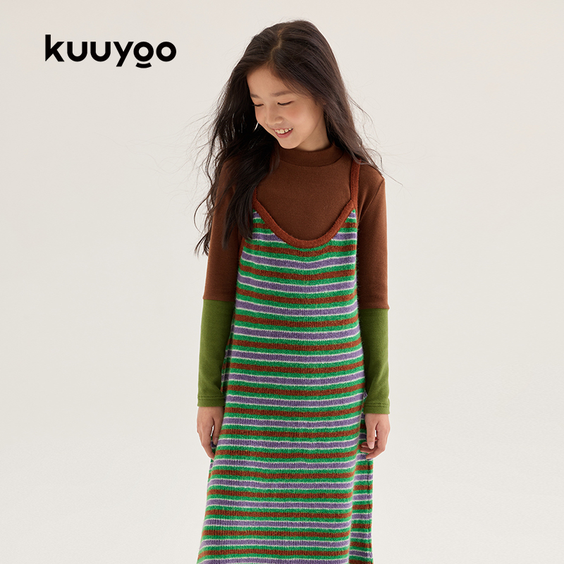 KUUYOO儿童条纹吊带连衣裙秋冬款中大童高弹面料细腻柔和上衣长裙