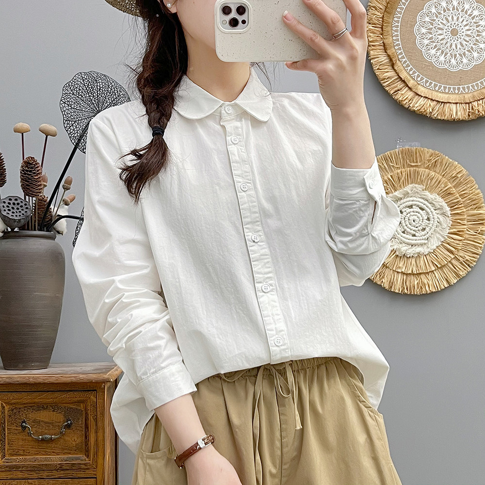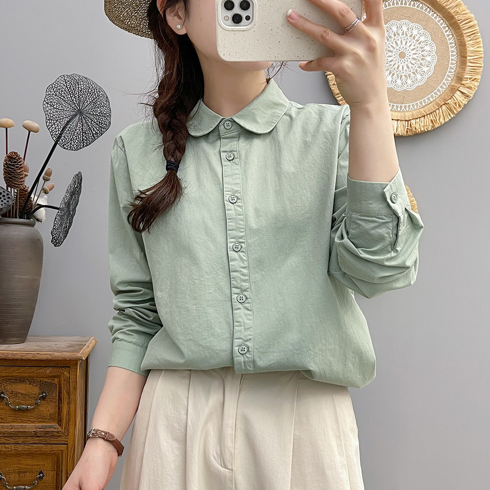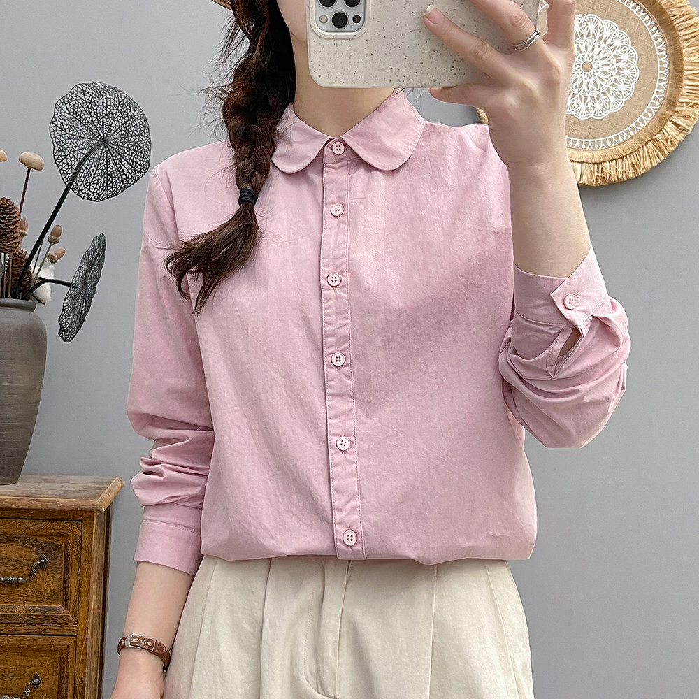 小众别致上衣2024春秋复古文艺全棉衬衫女长袖休闲娃娃领纯棉衬衣