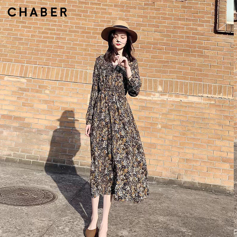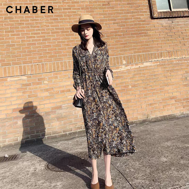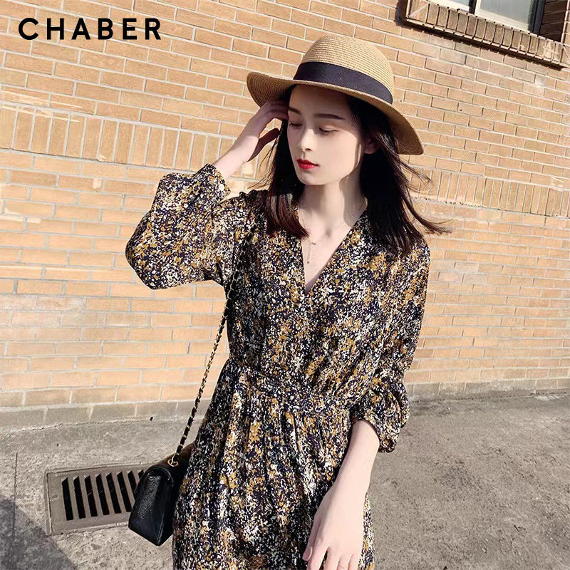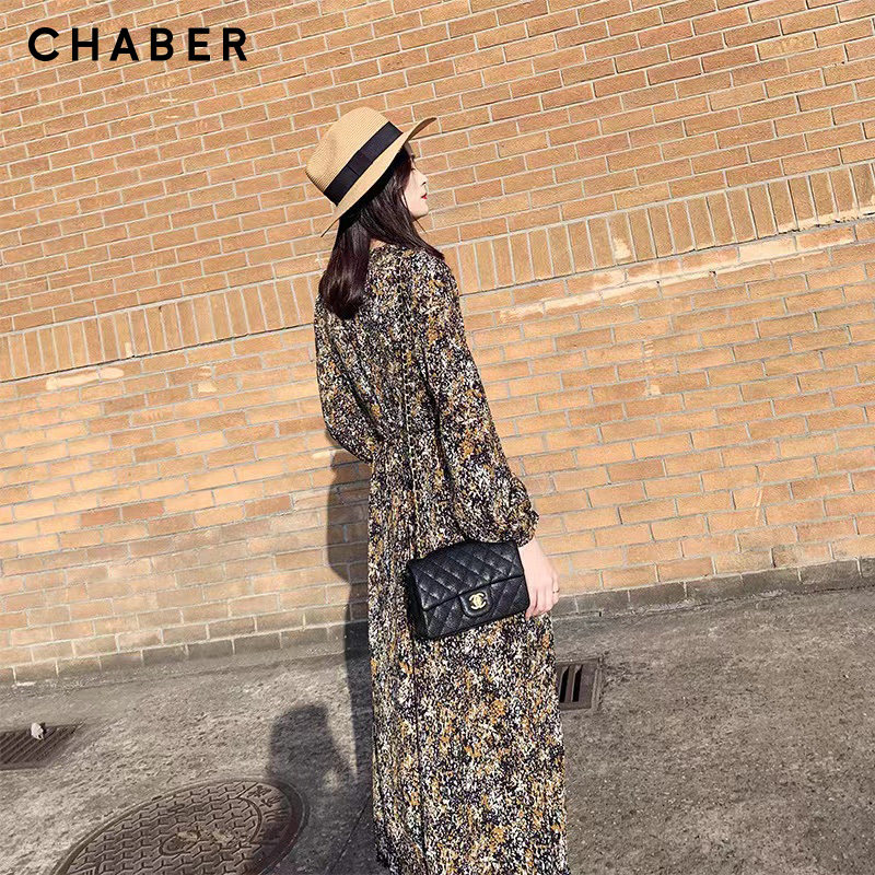 chaber巧帛23春季新品V领优雅显瘦长袖碎花长款A型连衣裙