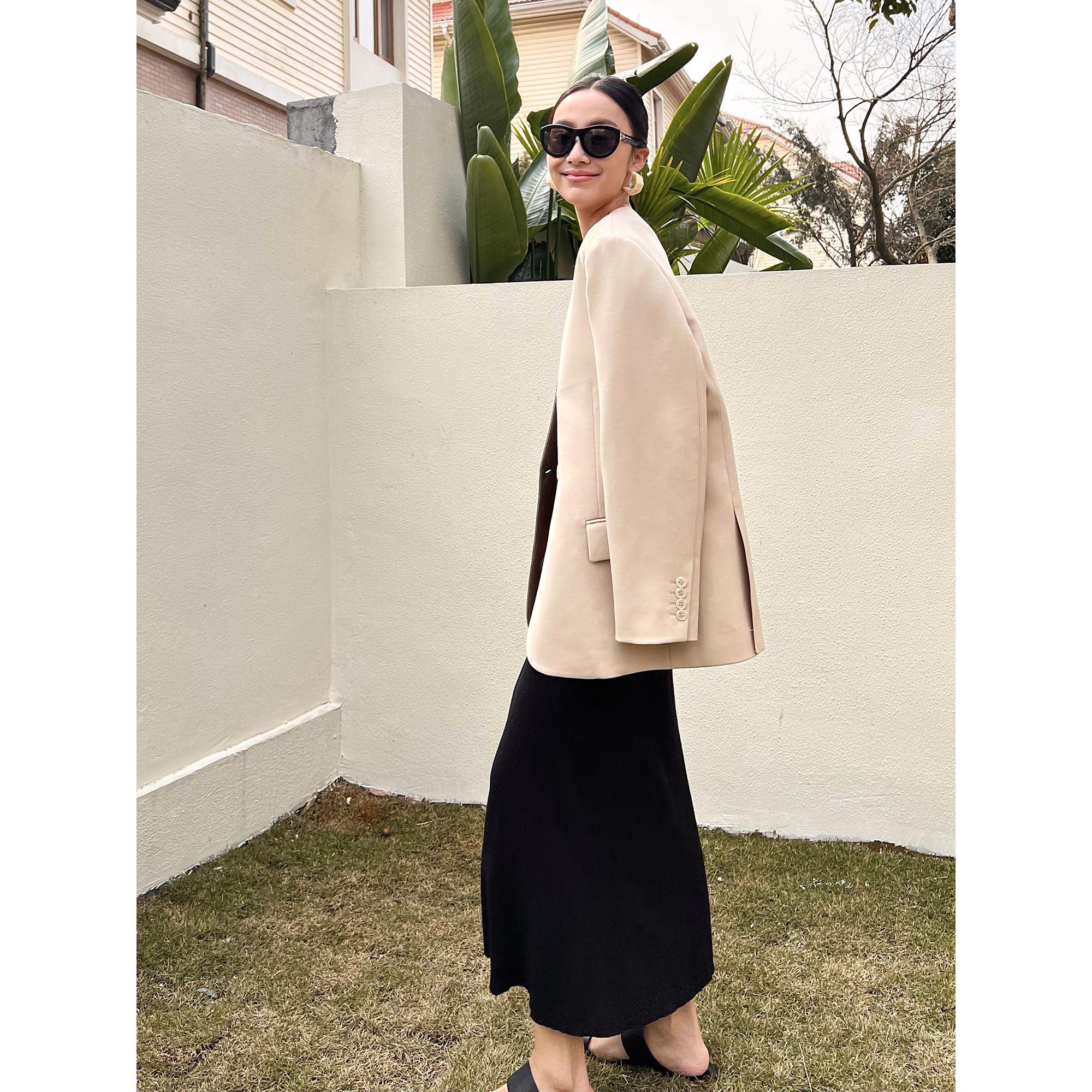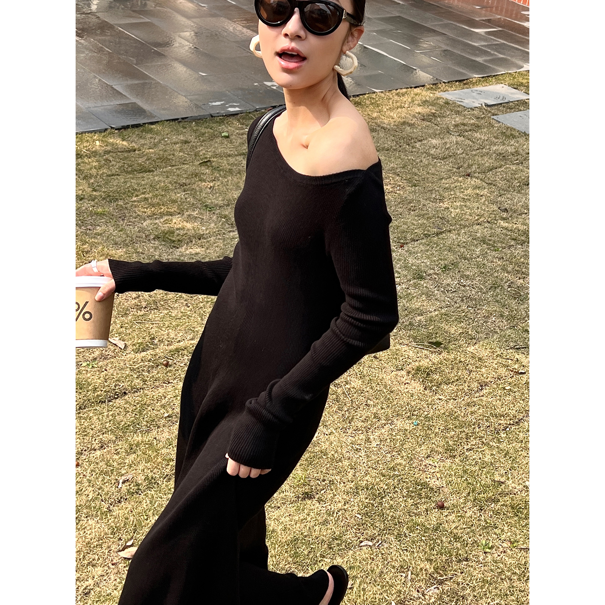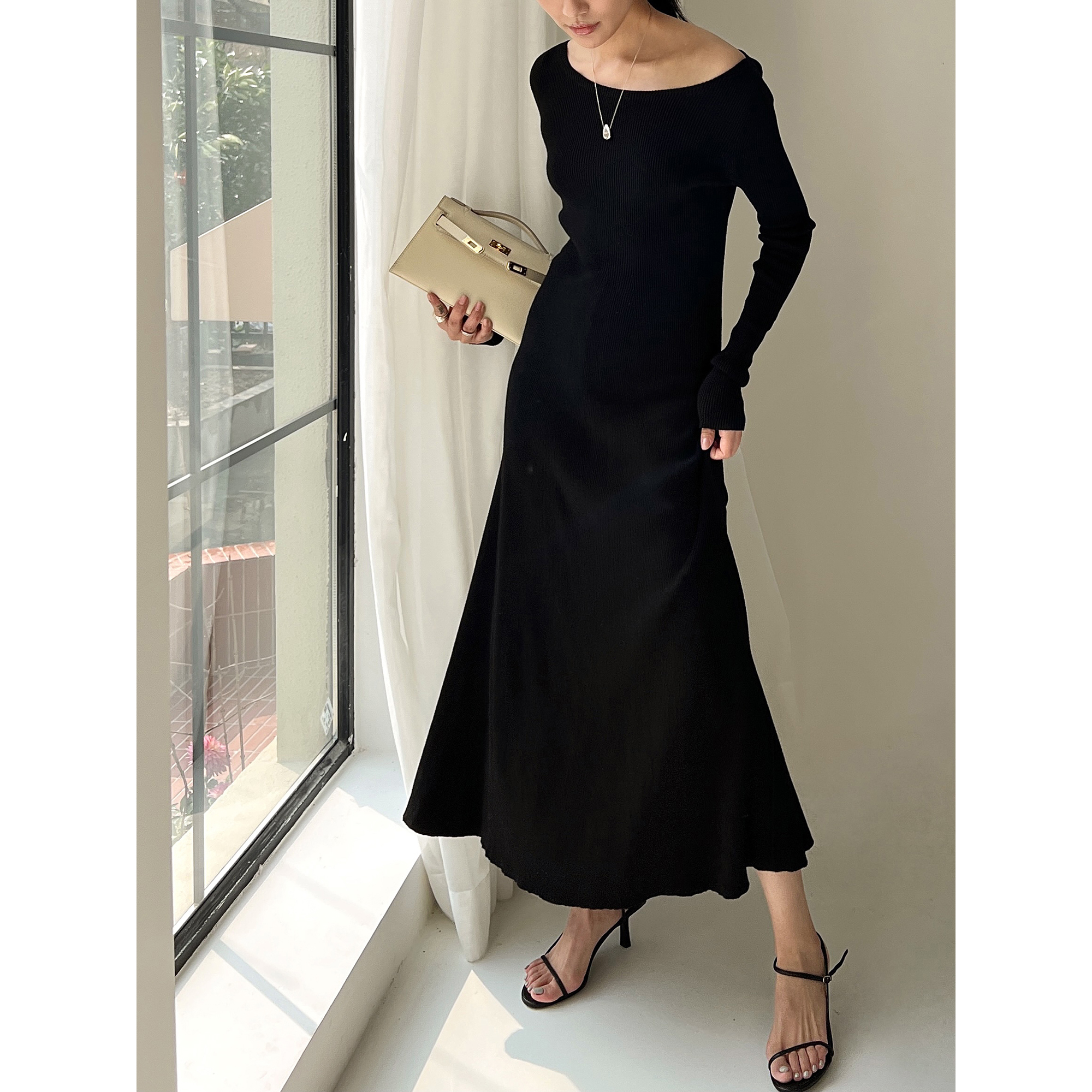一字领修身长裙舒适黑色