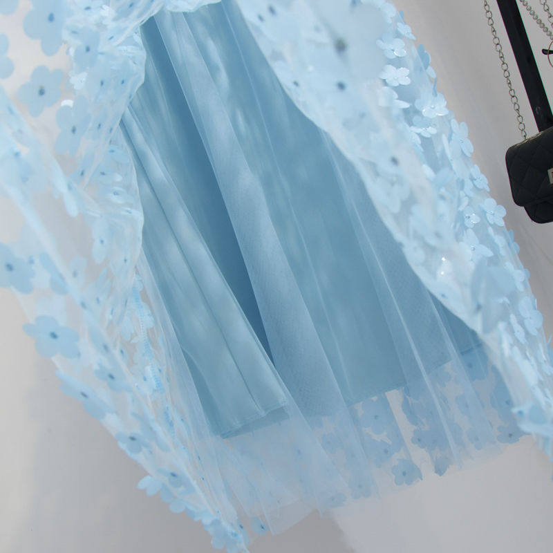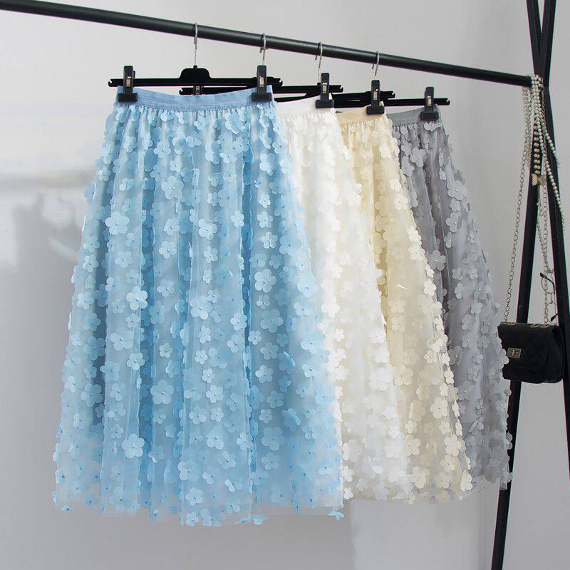 超美重工立体小花朵刺绣网纱a字半身裙高腰显瘦中长款蓬蓬仙女裙
