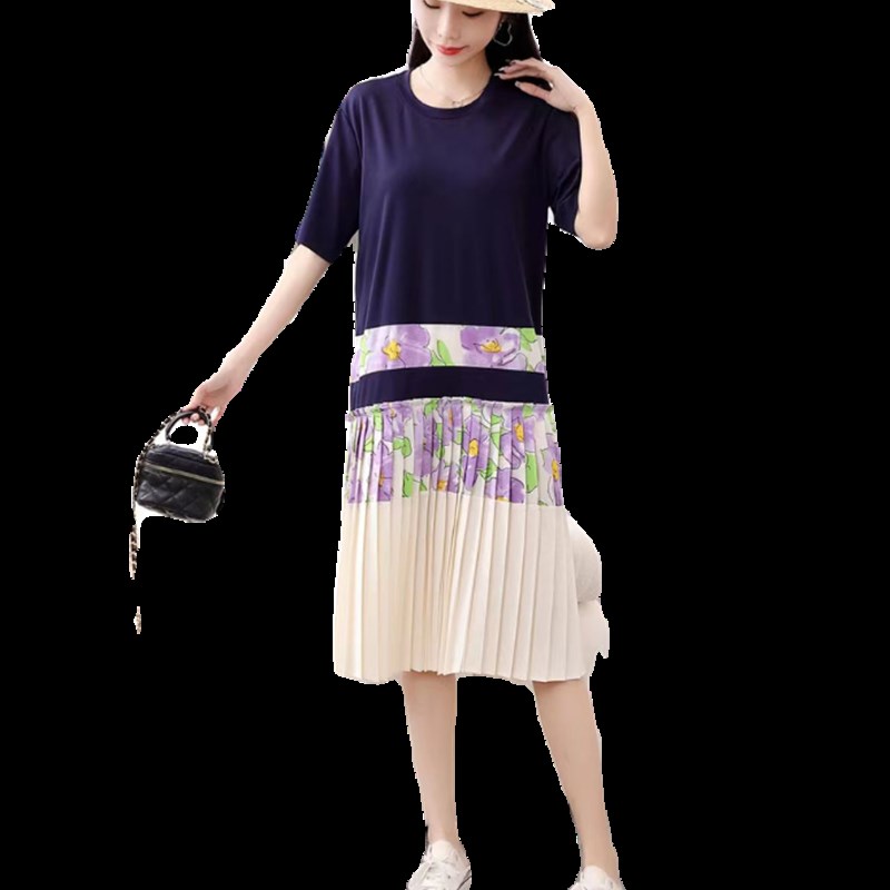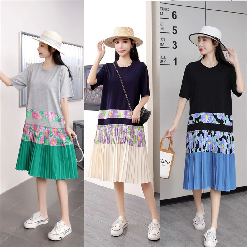 夏装新款港风短袖中长款连衣裙女宽松显瘦拼接撞色清新碎花长裙子