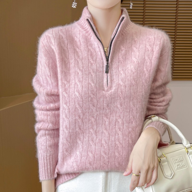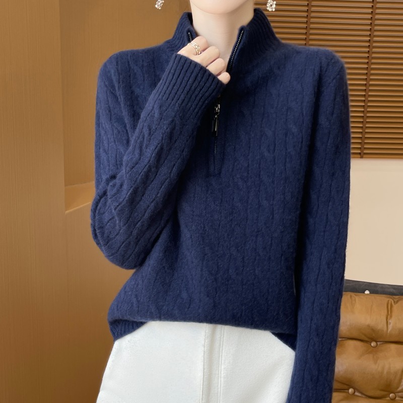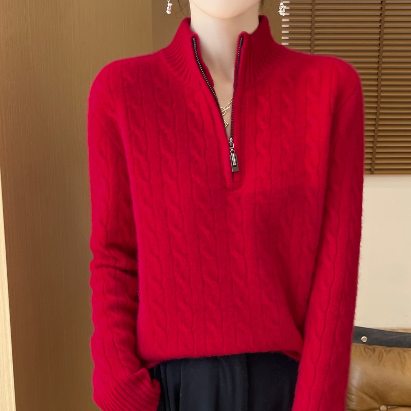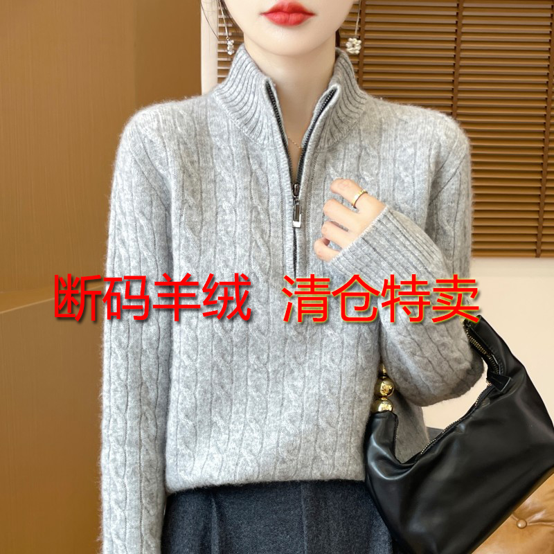 鄂尔多斯市半拉链羊绒衫立领毛衣女麻花纹宽松针织衫秋冬加厚打底
