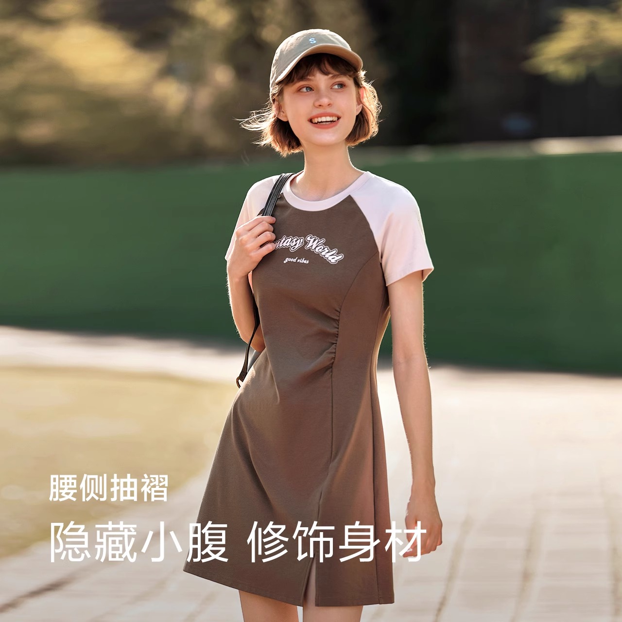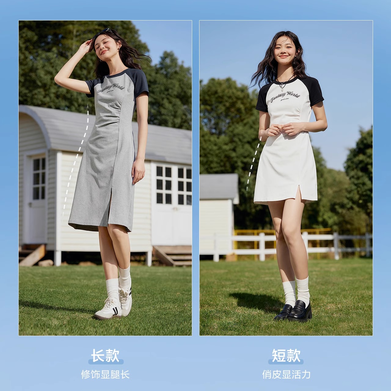 森马连衣裙女撞色圆领修身夏季新款小个子字母开叉T恤裙休闲裙子