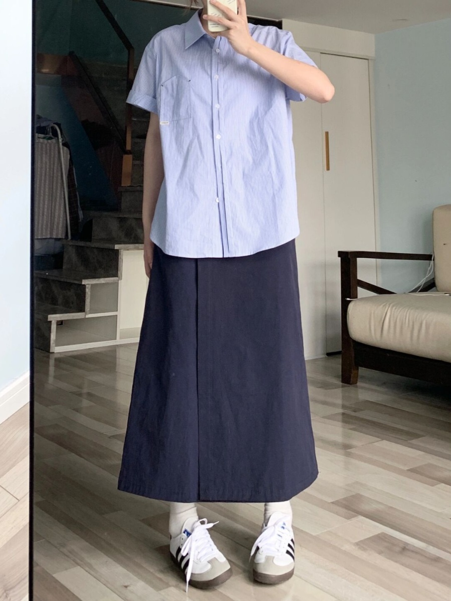 韩系学院风蓝条纹衬衫女装夏季新款小个子简约文艺polo领短袖上衣