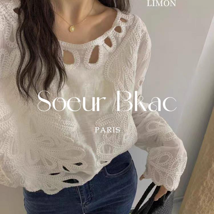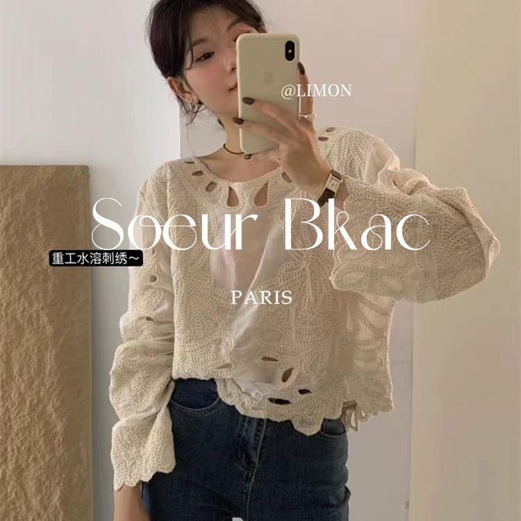 法国SOEUR BKAC法式杏色设计感秋季镂空刺绣衬衫百搭露肩上衣女
