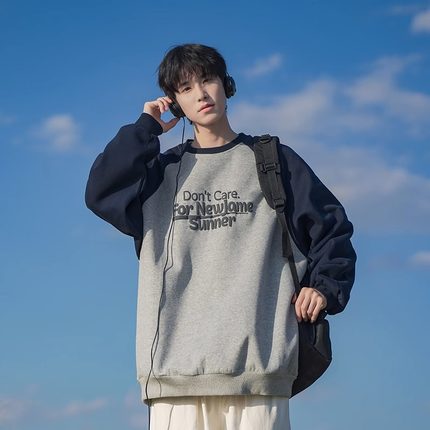日系复古撞色圆领卫衣男生春秋冬潮牌宽松插肩袖套头上衣加绒加厚