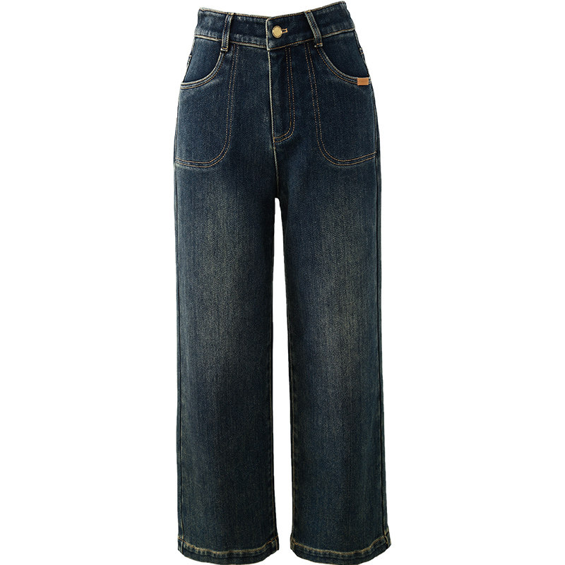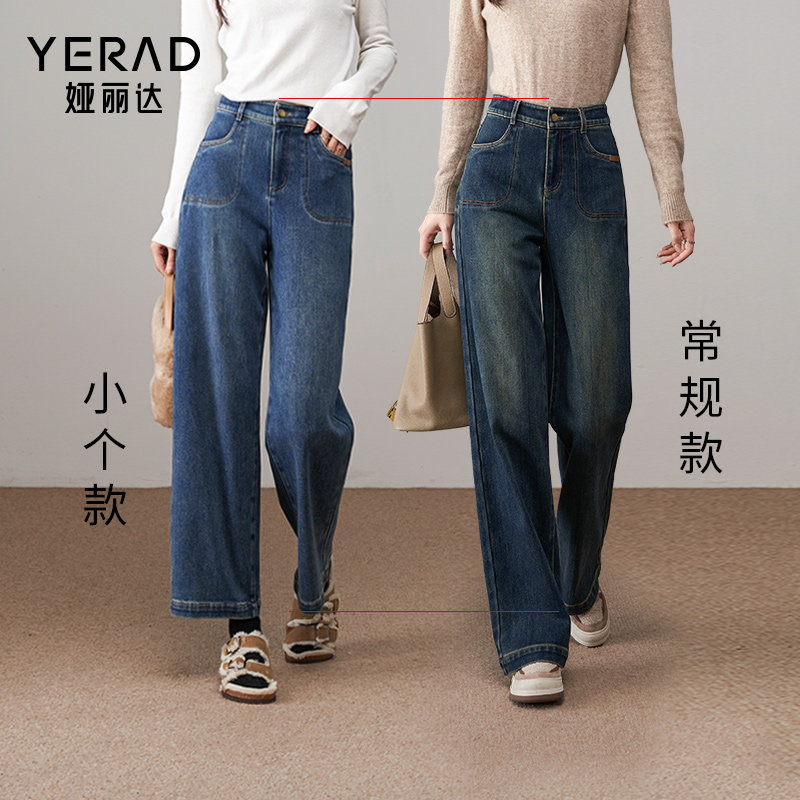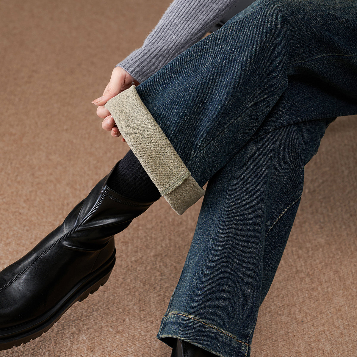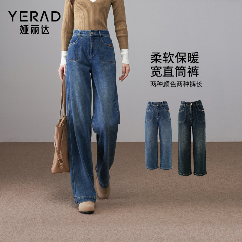 娅丽达加绒宽直筒裤冬季雪绒牛仔裤女2025新款小个子九分怀旧裤子