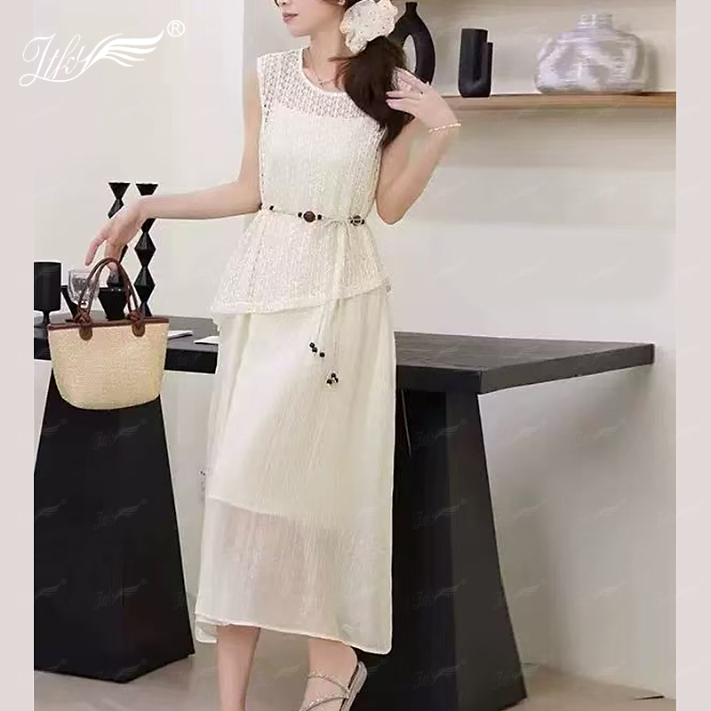 2025新款时尚连衣裙套装圆领无袖镂空针织背心罩衫搭吊带裙两件套