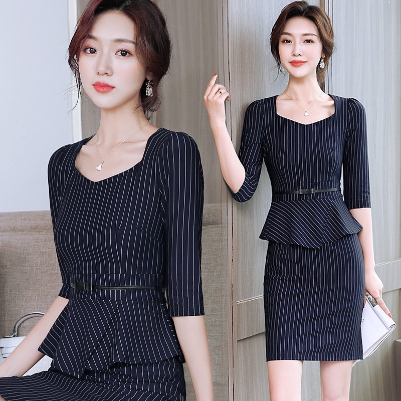 职业连衣裙女春夏季方领中袖酒店珠宝店工作服高端假两件工装套裙