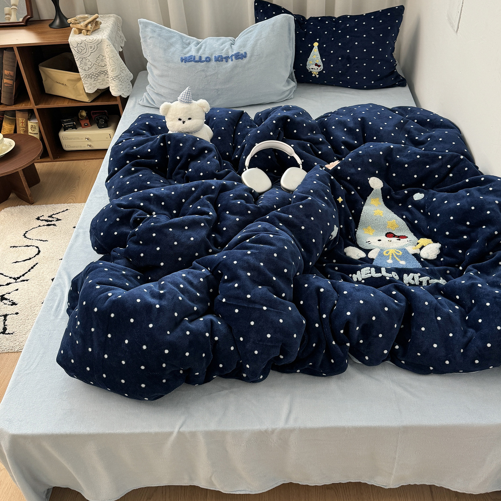 ins可爱波点星星猫冬季保暖牛奶绒毛巾绣四件套舒适珊瑚绒三件套
