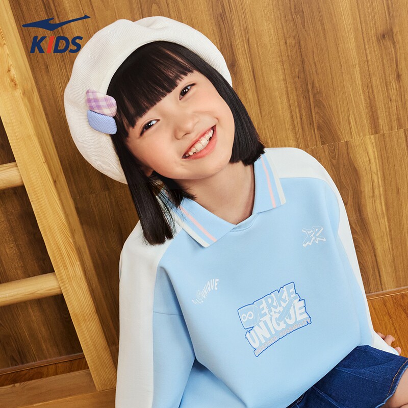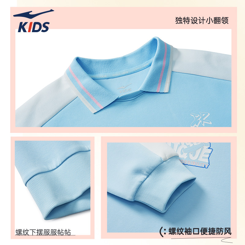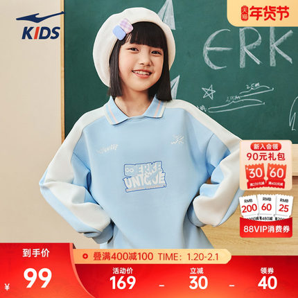 鸿星尔克童中性女童2026冬季新款印花翻领拼接套头卫衣上衣长袖