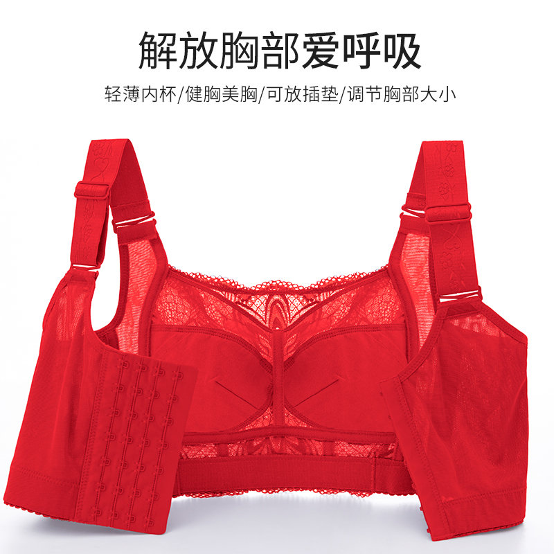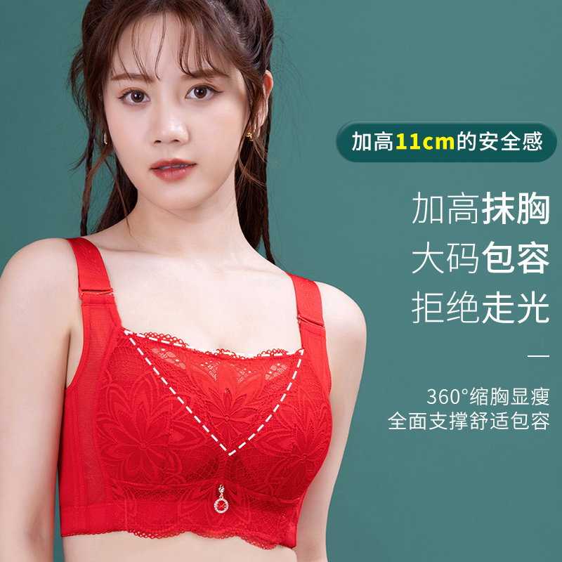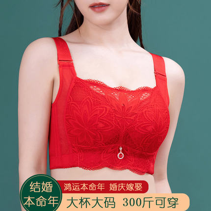 红色蕾丝内衣结婚新娘本命年薄款胸大显小胸无钢圈聚拢大码文胸女