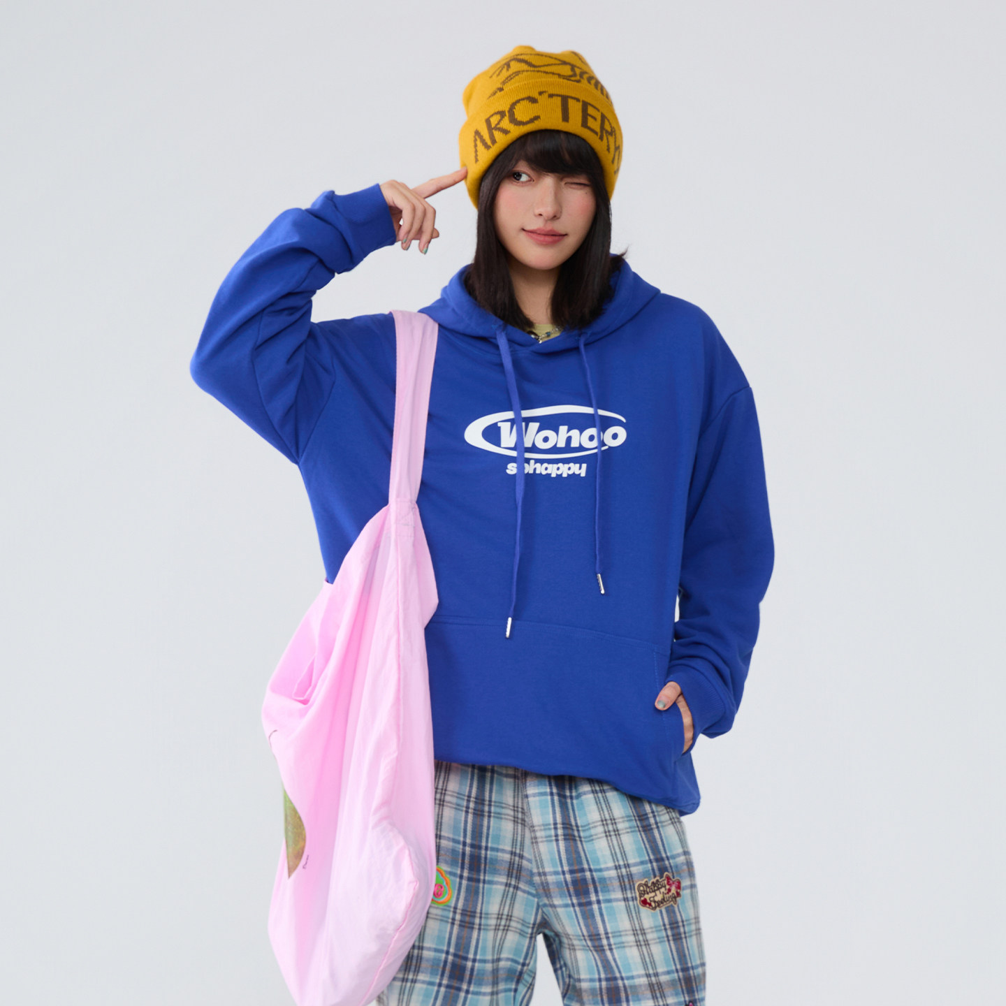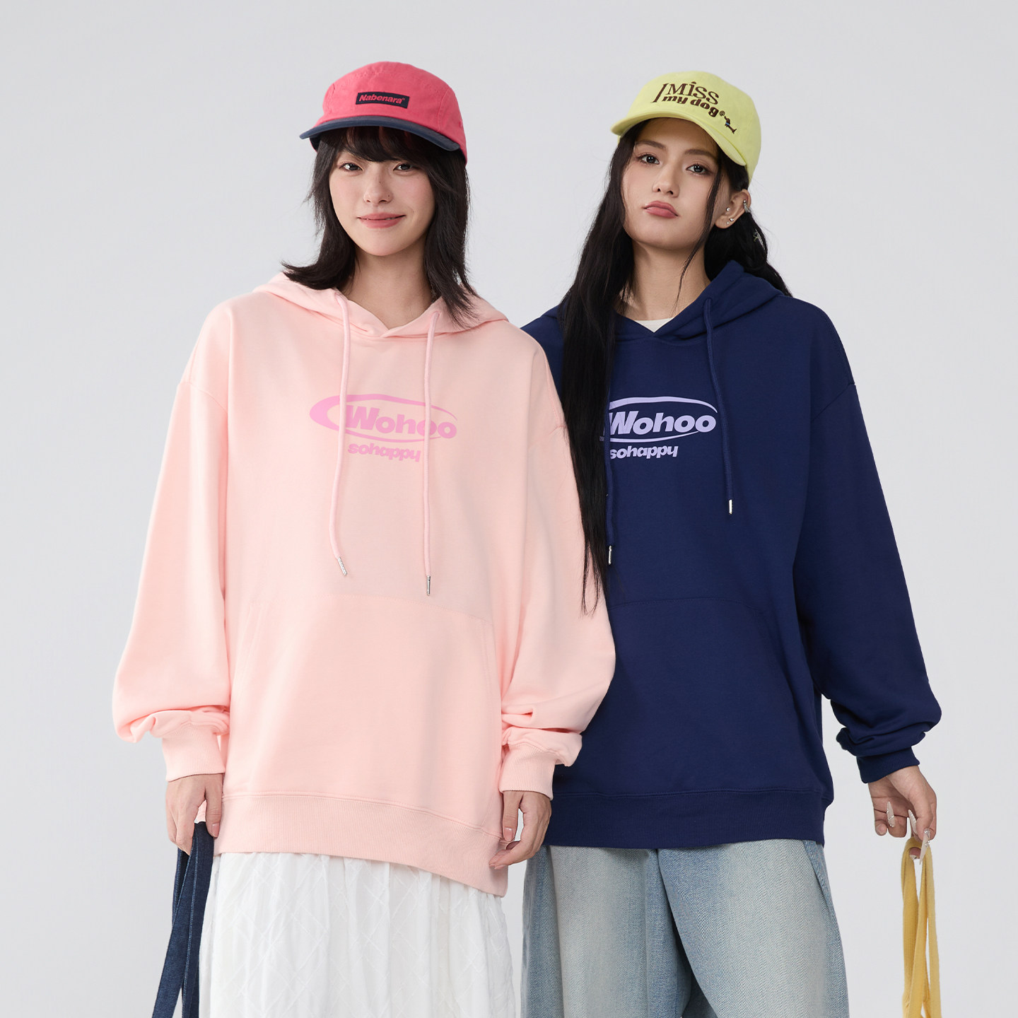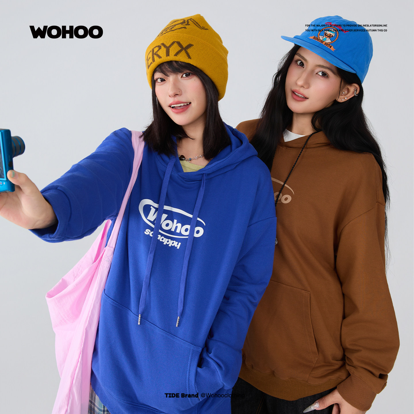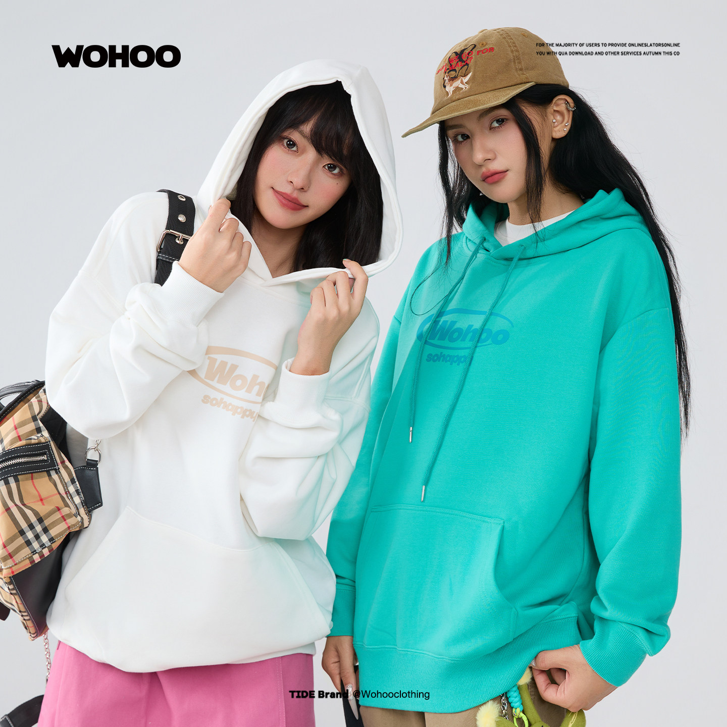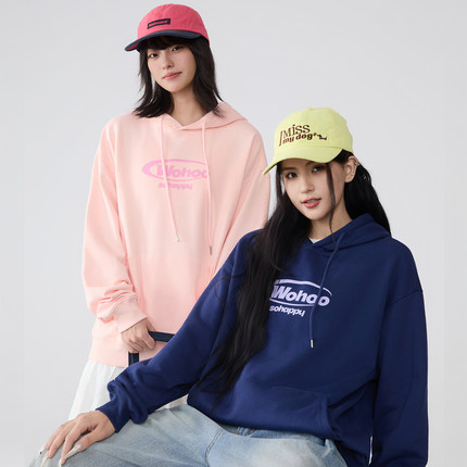 WOHOO连帽简约印花套头卫衣男女早秋潮牌情侣装重磅纯色套头帽衫