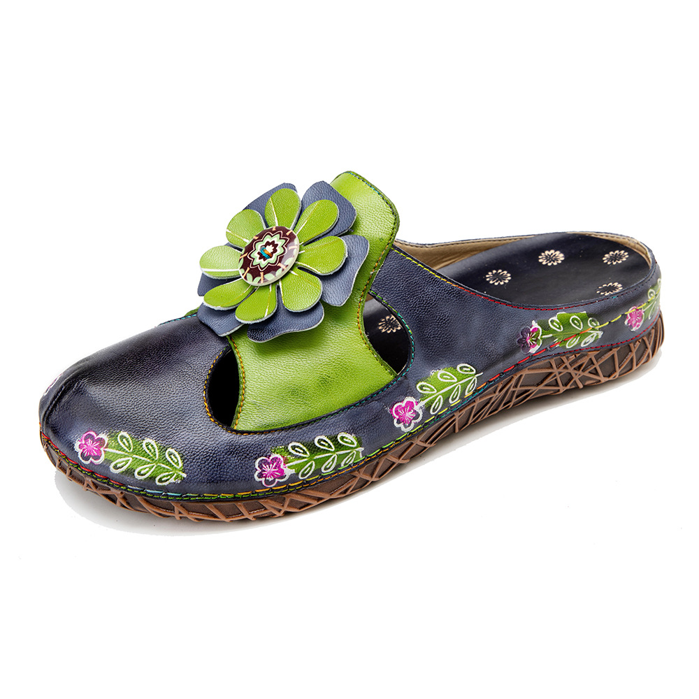 送运险真皮包头拖鞋软底夏季花朵民族风女鞋拼色彩色平底大码凉鞋