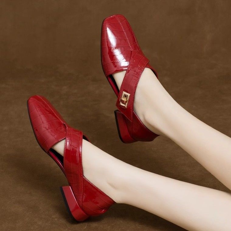 头层牛皮2024新款漆皮女鞋方头镂空凉单鞋平底鞋中跟低跟小皮鞋