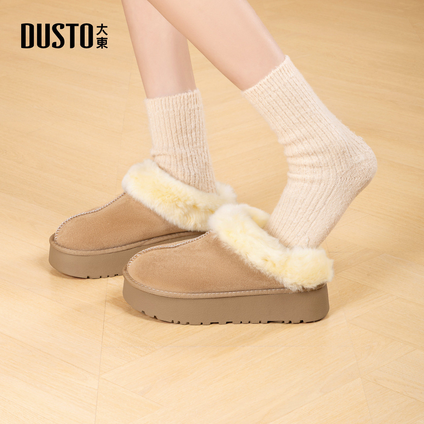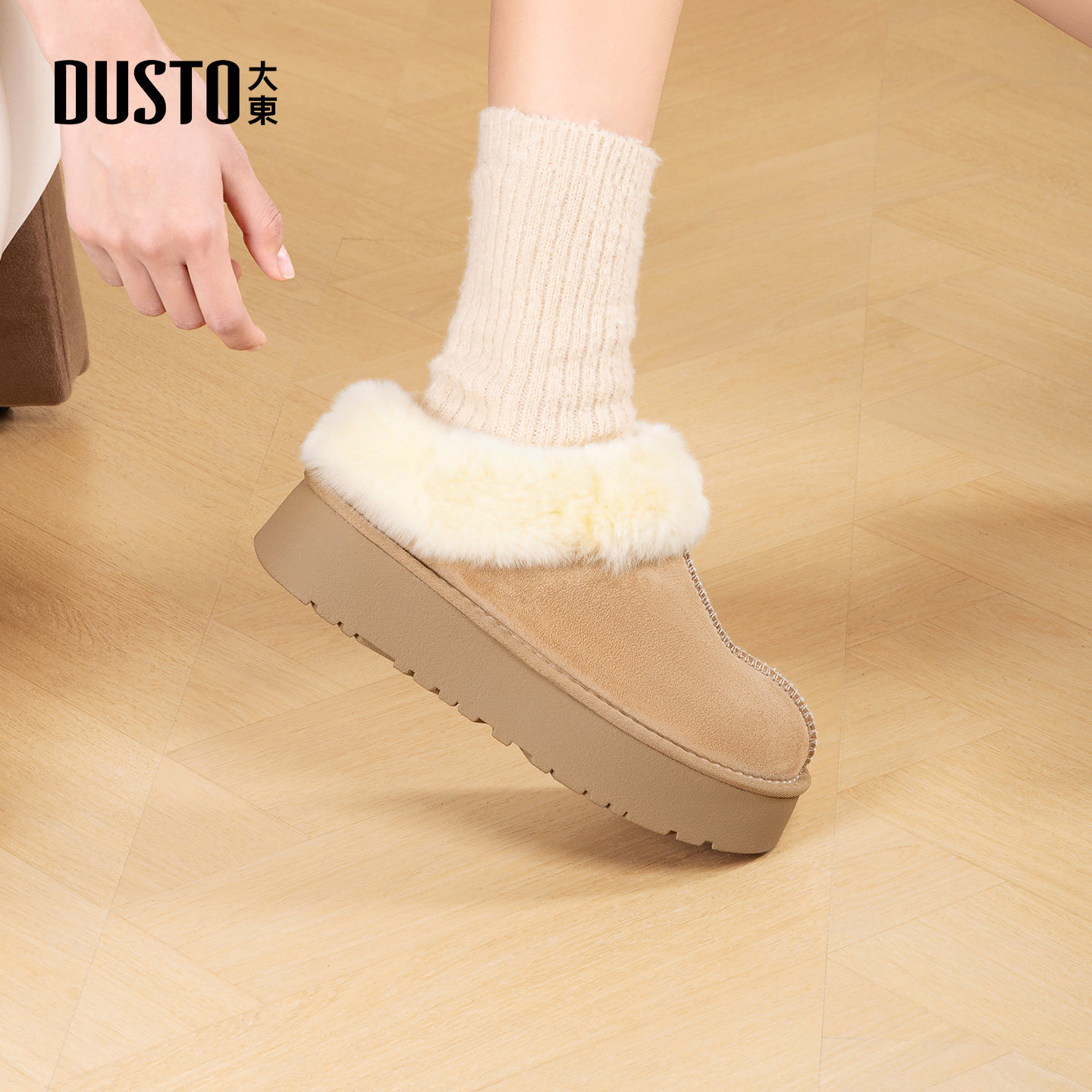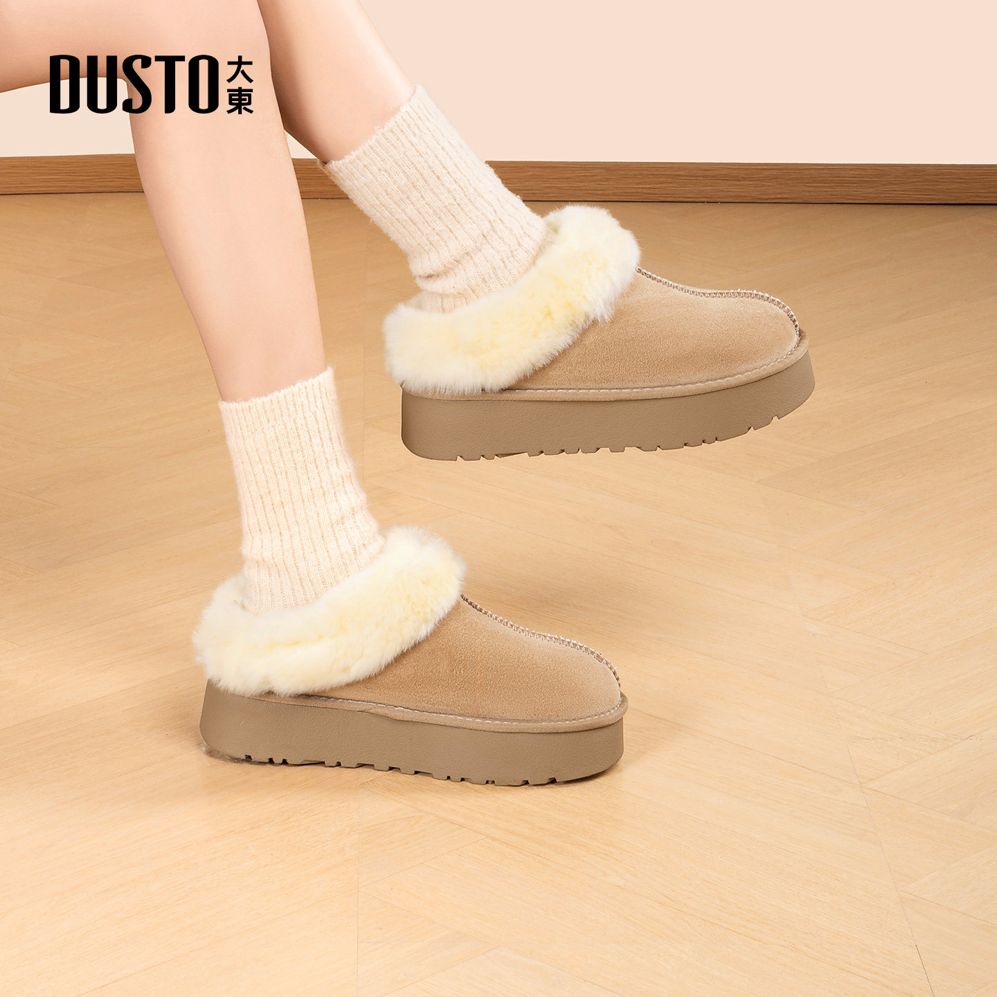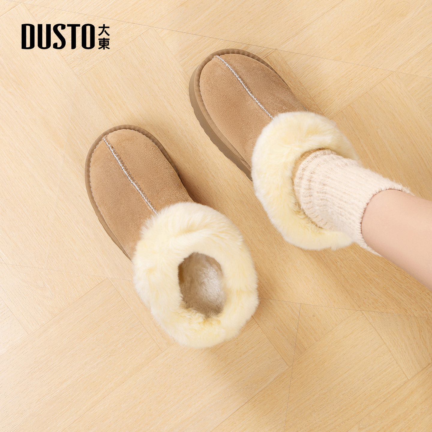大东雪地靴女鞋2025年冬季新款舒适平底中跟套脚圆头皮草D0230
