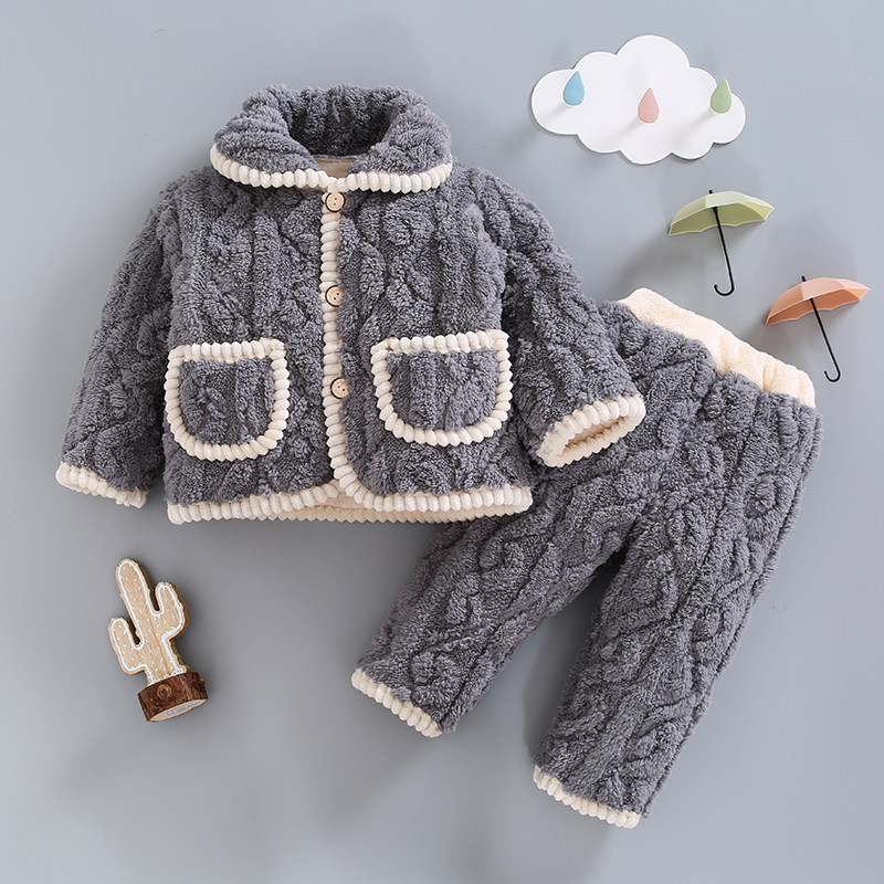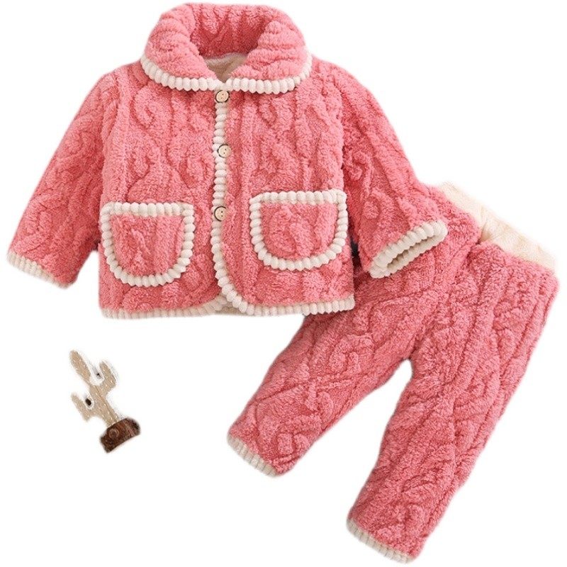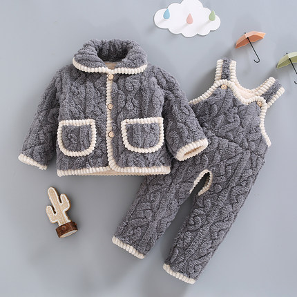 宝宝棉服棉袄冬季背带裤套装加厚加绒外穿男童法兰绒睡衣家居服冬