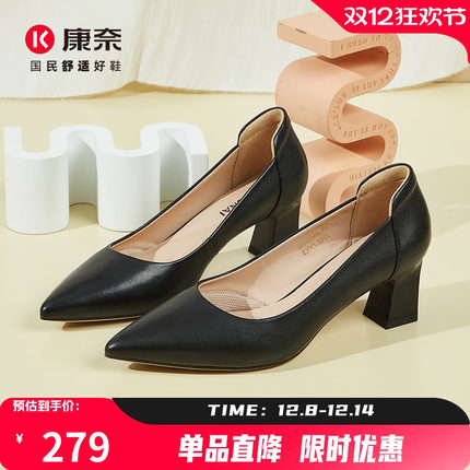 康奈通勤尖头高跟鞋女秋季真皮浅口粗跟女单鞋OL都市女鞋