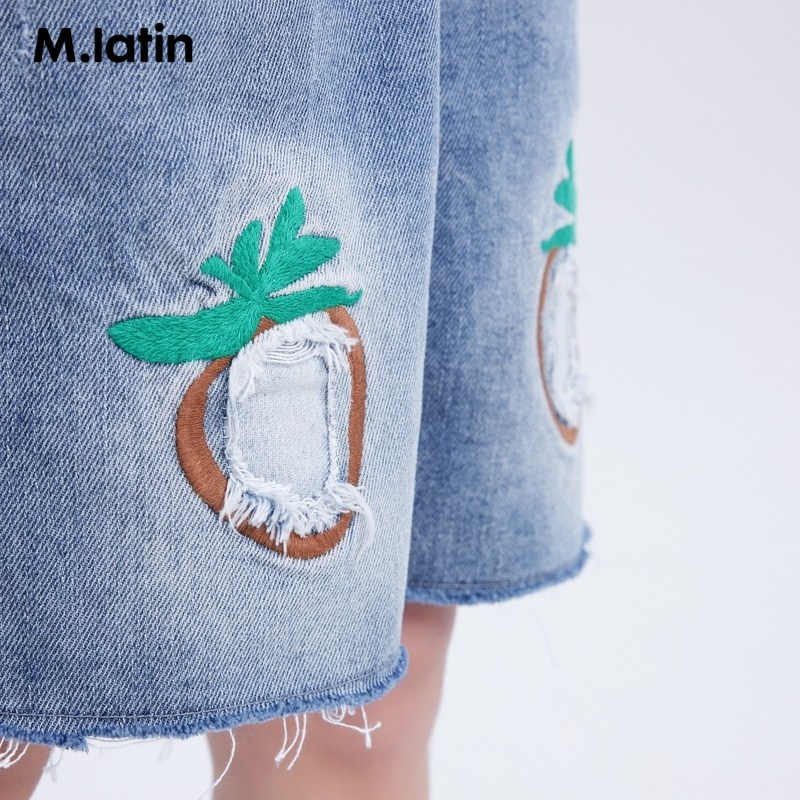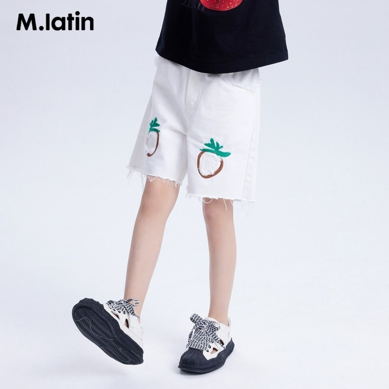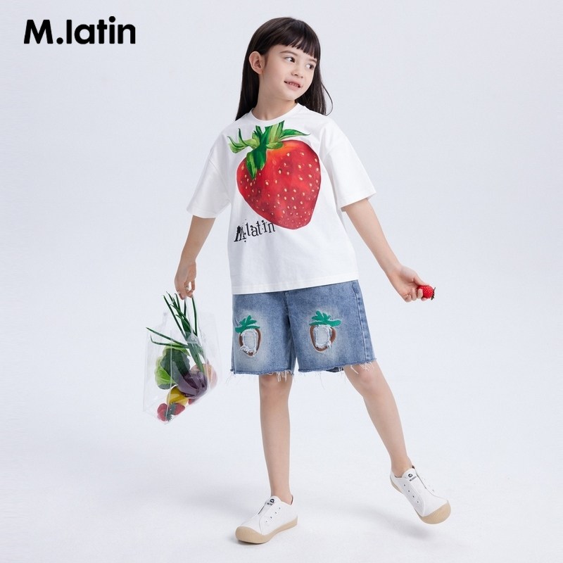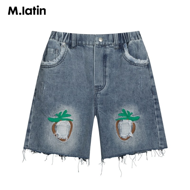 【冰氧酷】马拉丁童装女童牛仔短裤夏装新款草莓绣花破洞裤子