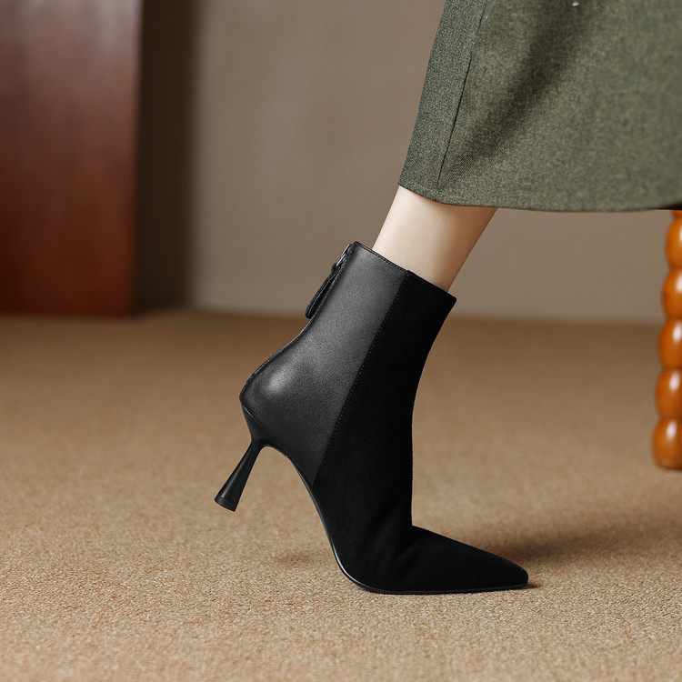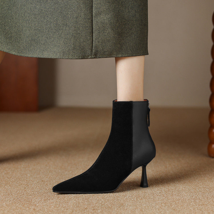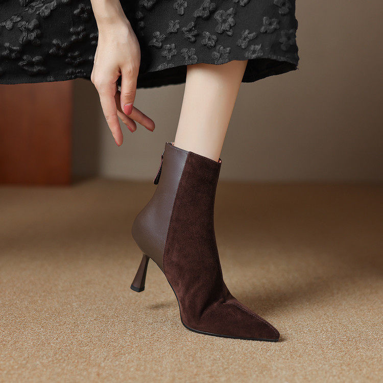 新品手工真皮羊皮磨砂皮短靴女尖头细跟高跟裸靴瘦瘦靴法式单靴