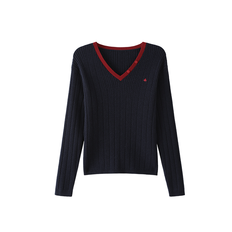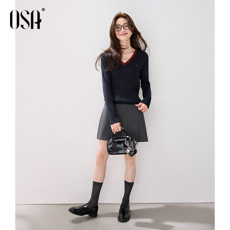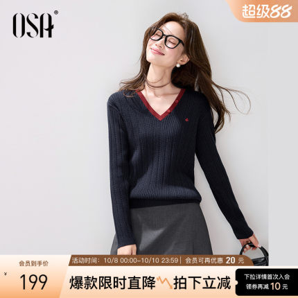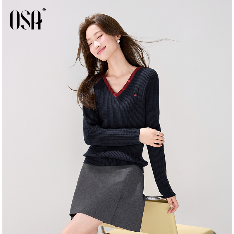 OSA欧莎绞花撞色v领羊毛衫女2025秋季新款复古慵懒打底针织衫上衣