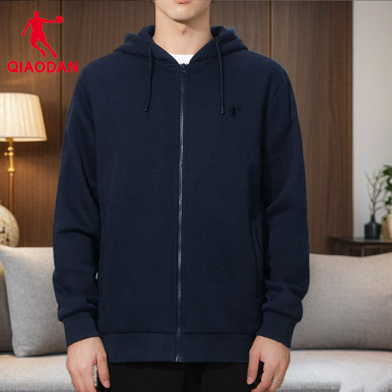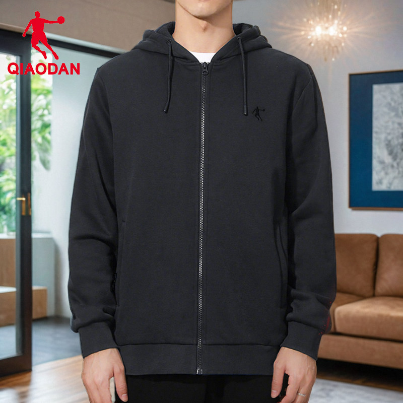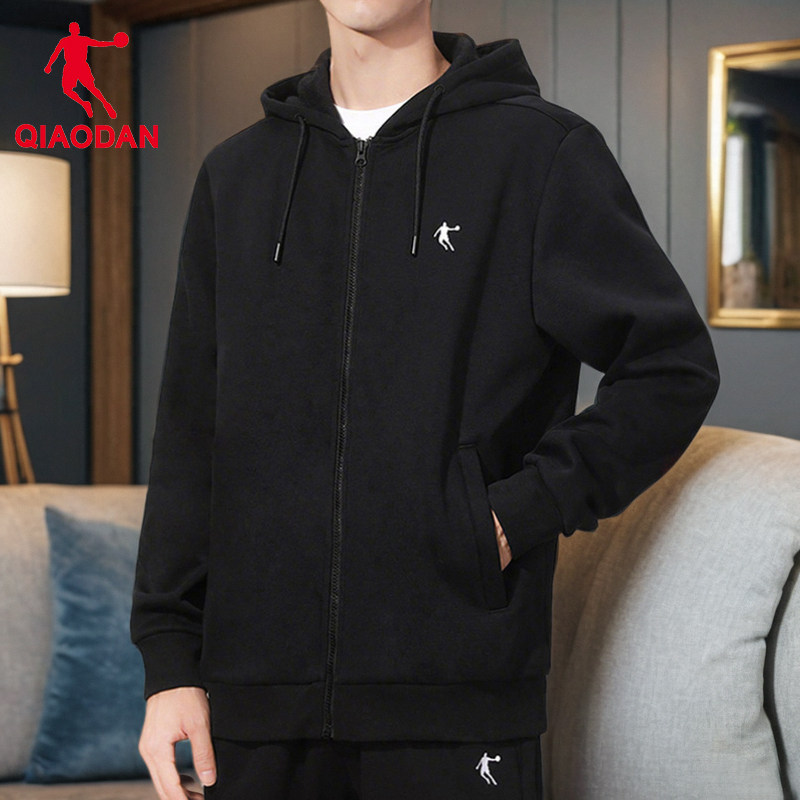 乔丹男士外套加绒保暖春秋季2025新款休闲黑色连帽运动服开衫