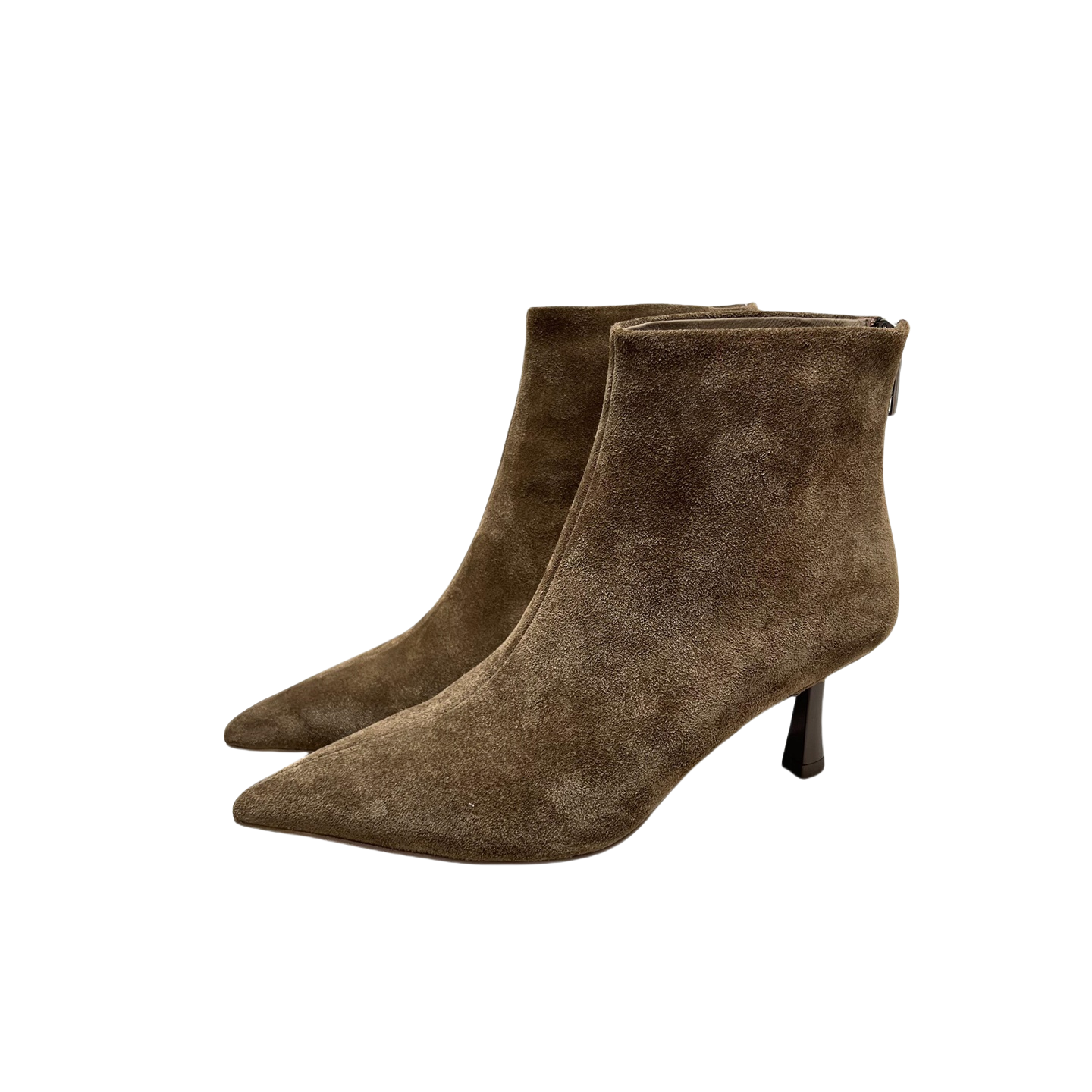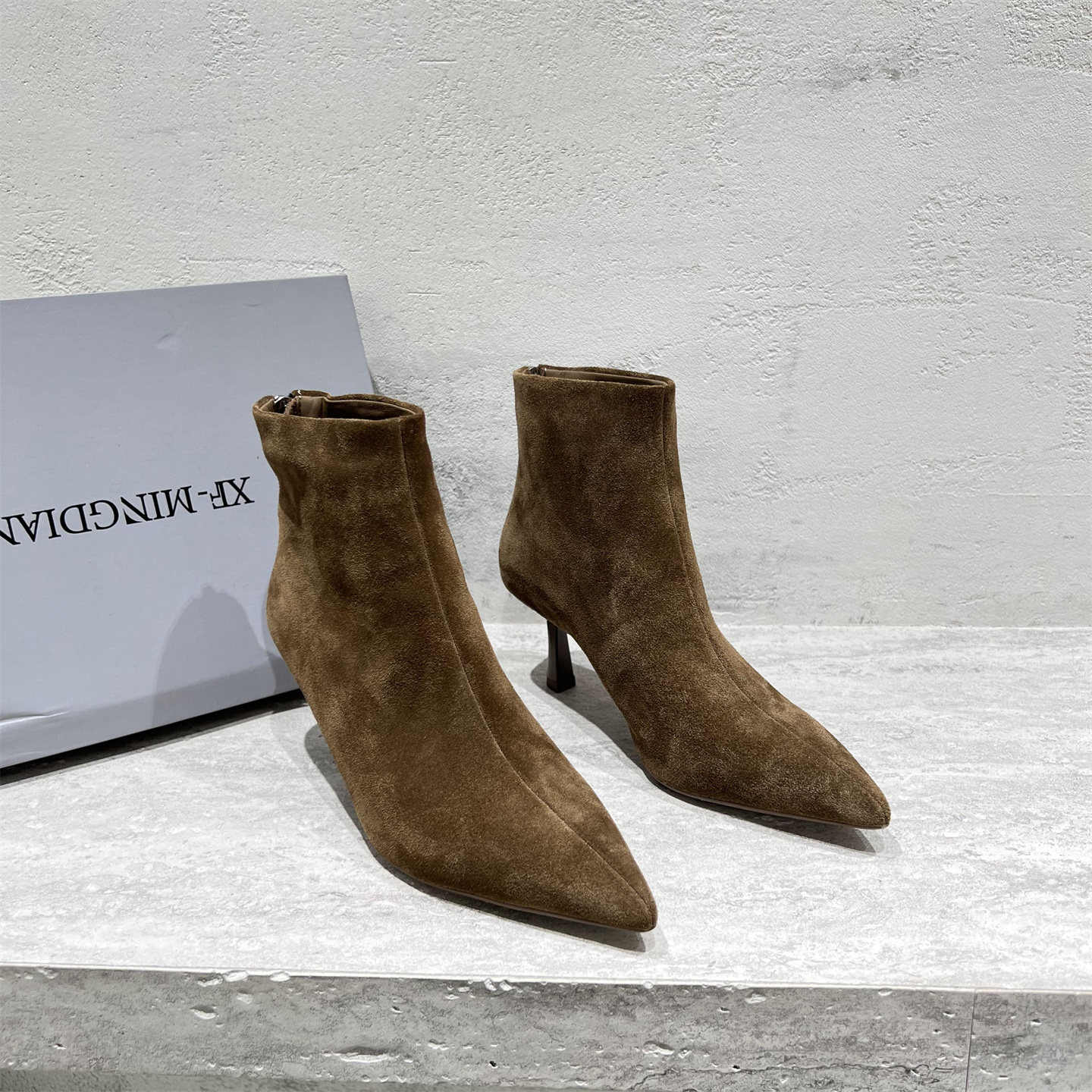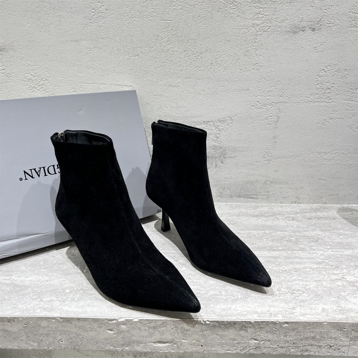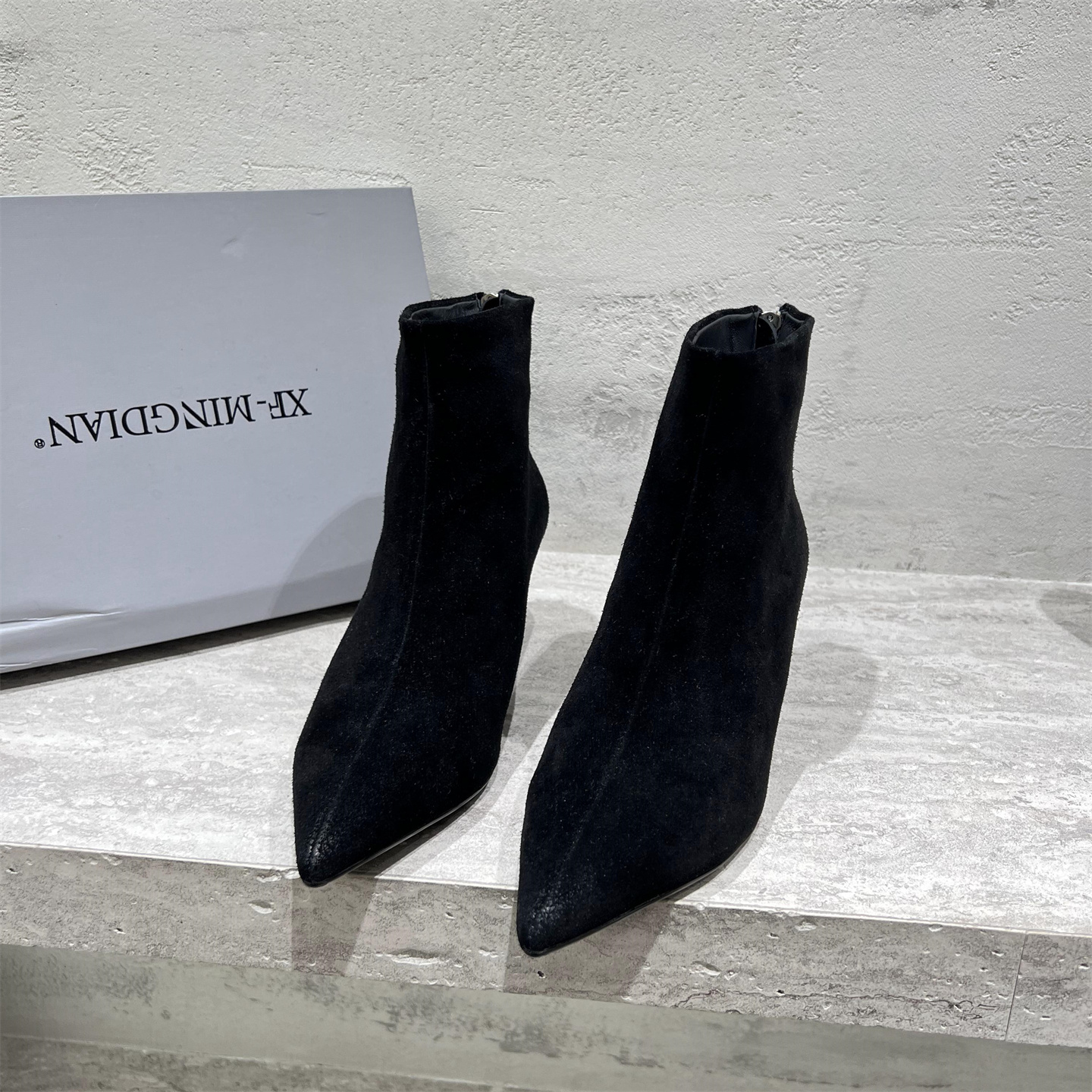 欧洲站女靴2025秋新款欧货真皮尖头细跟后拉链时尚高跟短靴马丁靴