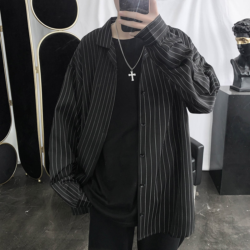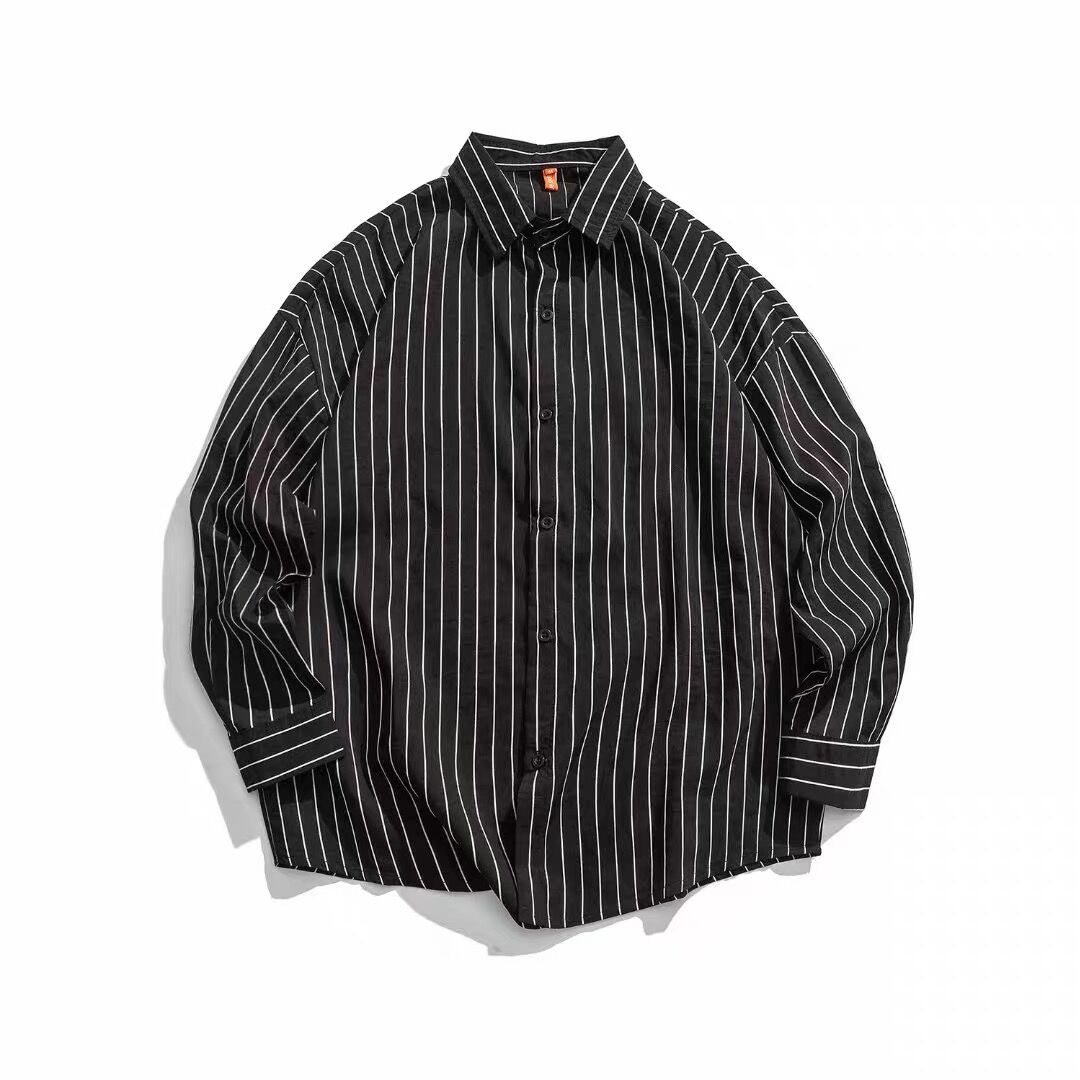 条纹衬衫外套男薄款夏季加肥加大码宽松休闲肥佬装男士长袖黑衬衣