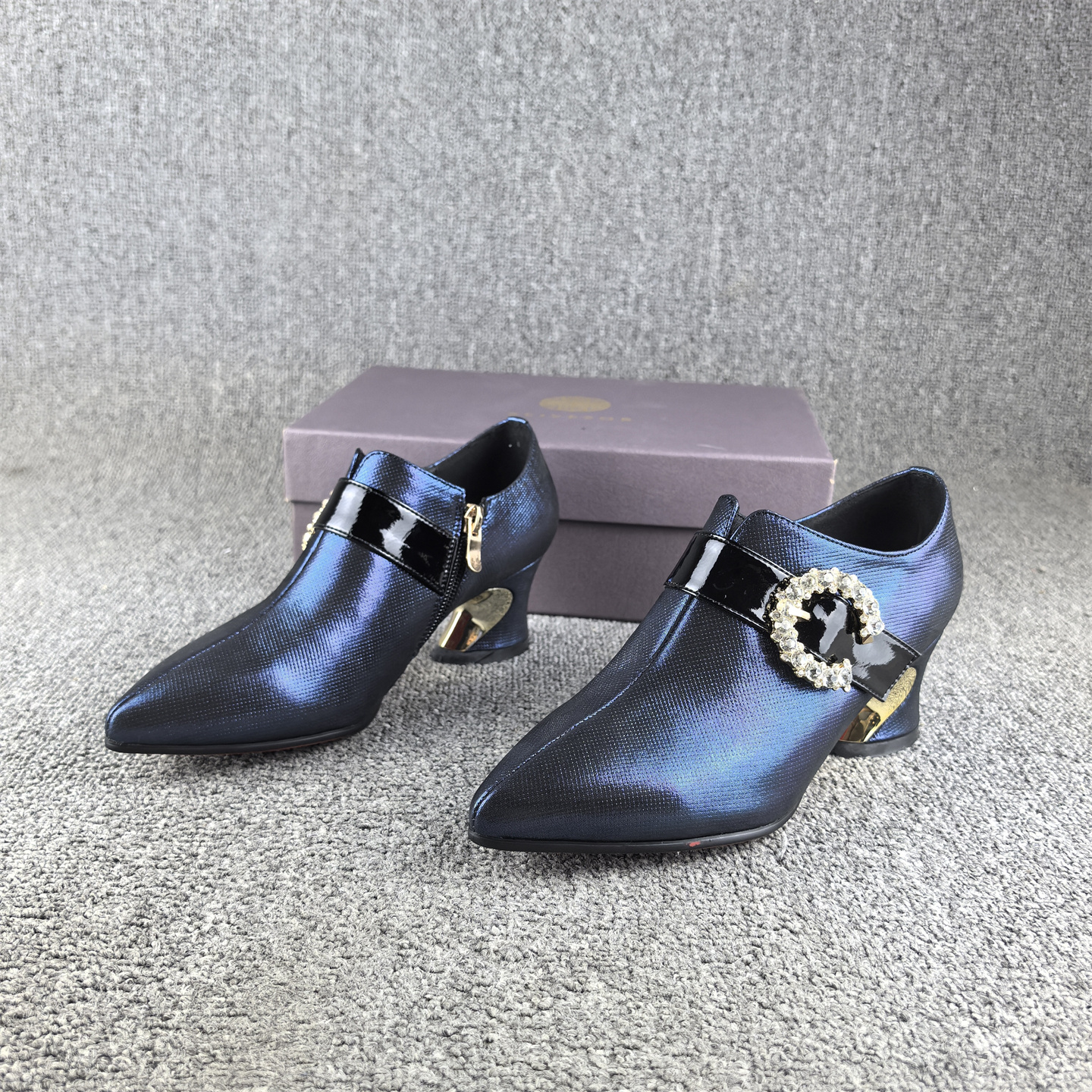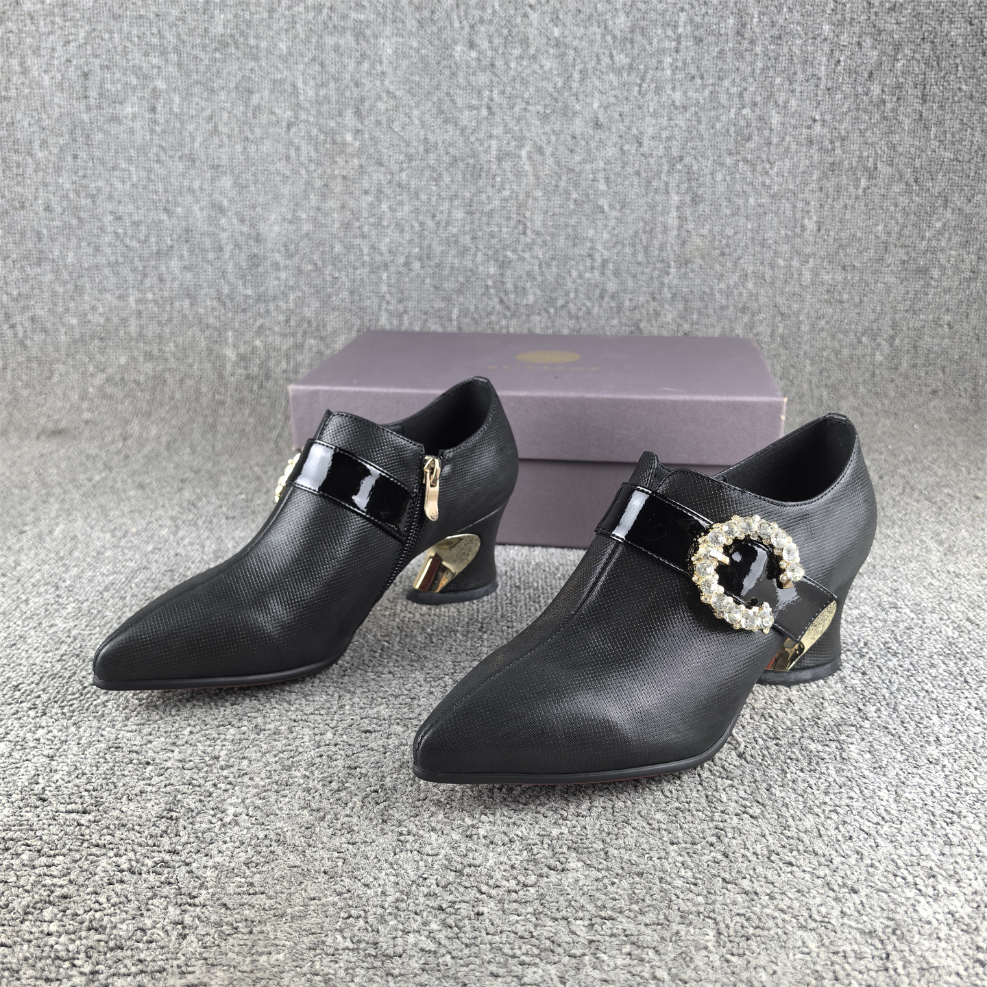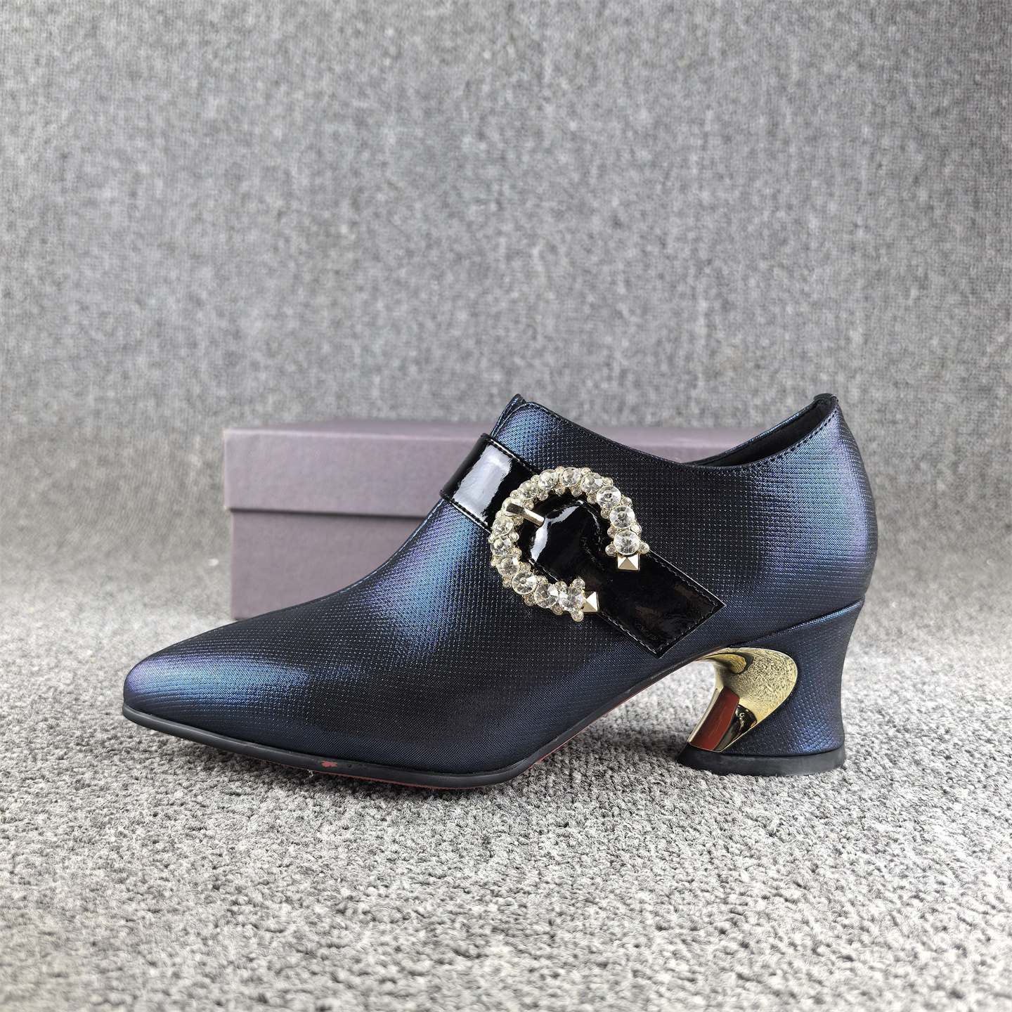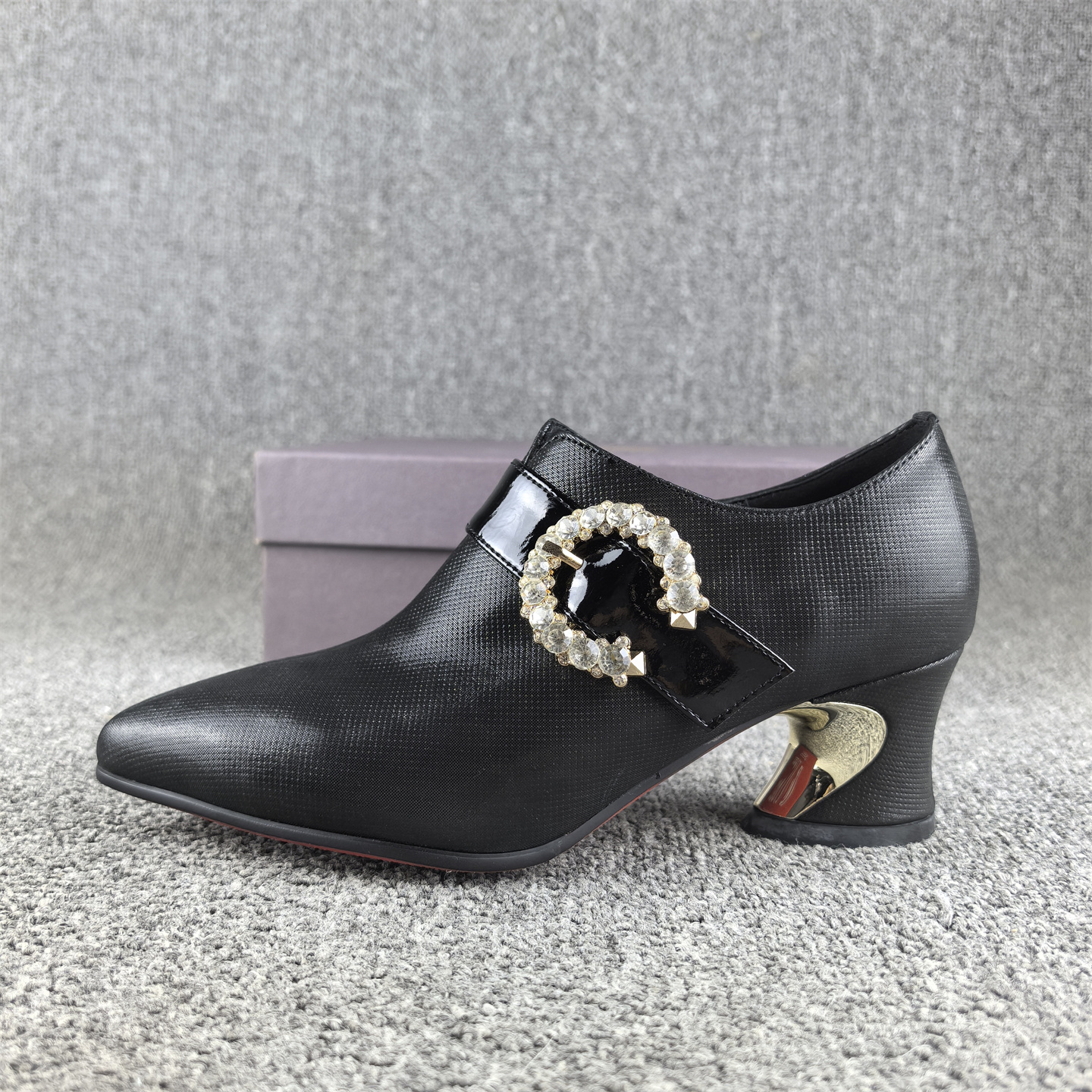 断码处理压纹羊皮民族风深口单鞋女春秋款尖头中跟真皮女鞋侧拉链