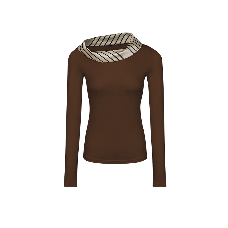 拼接领子设计莫代尔咖色T恤女