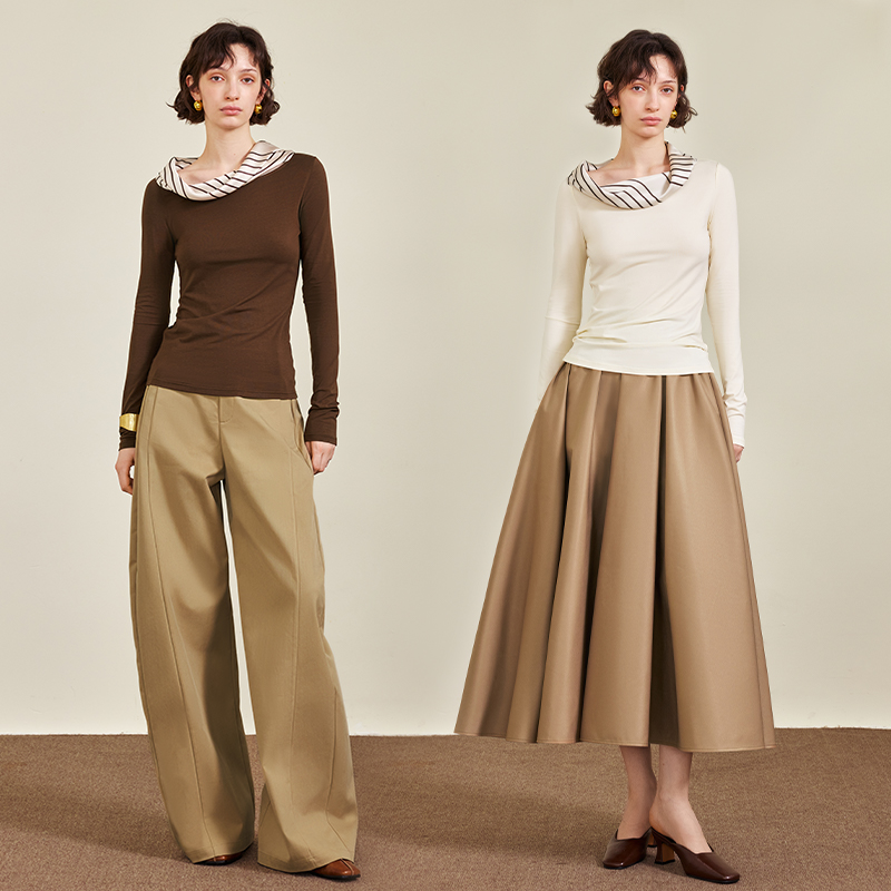 AEL原创拼接领子设计莫代尔斜肩T恤女2025秋季新款修身长袖上衣