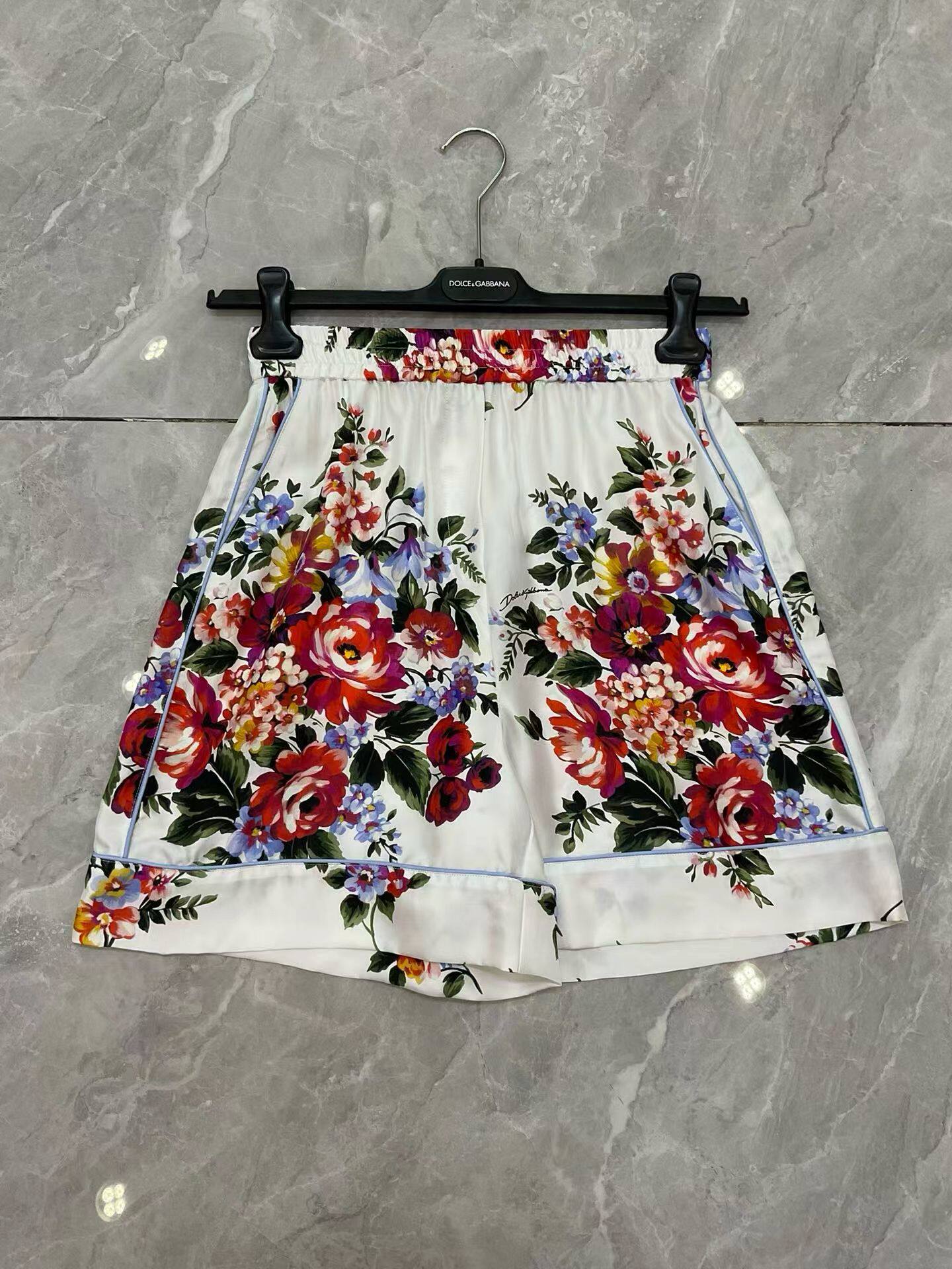 欧美女神蓝底大花16姆米真丝斜纹短袖时尚衬衫 短裤高品质
