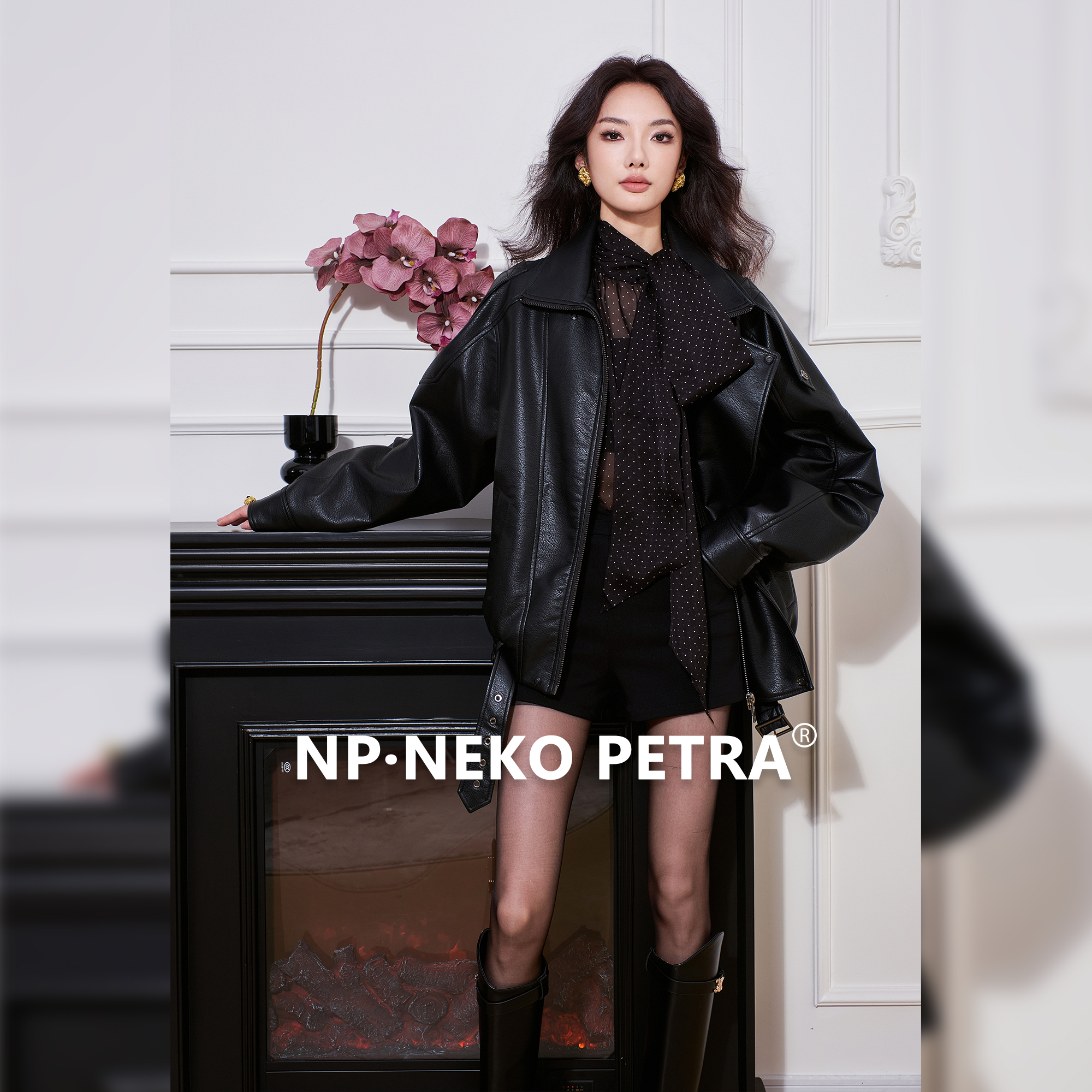Neko Petra高端肌理感阔版双领机车黑色皮衣女春秋时尚宽松显瘦酷